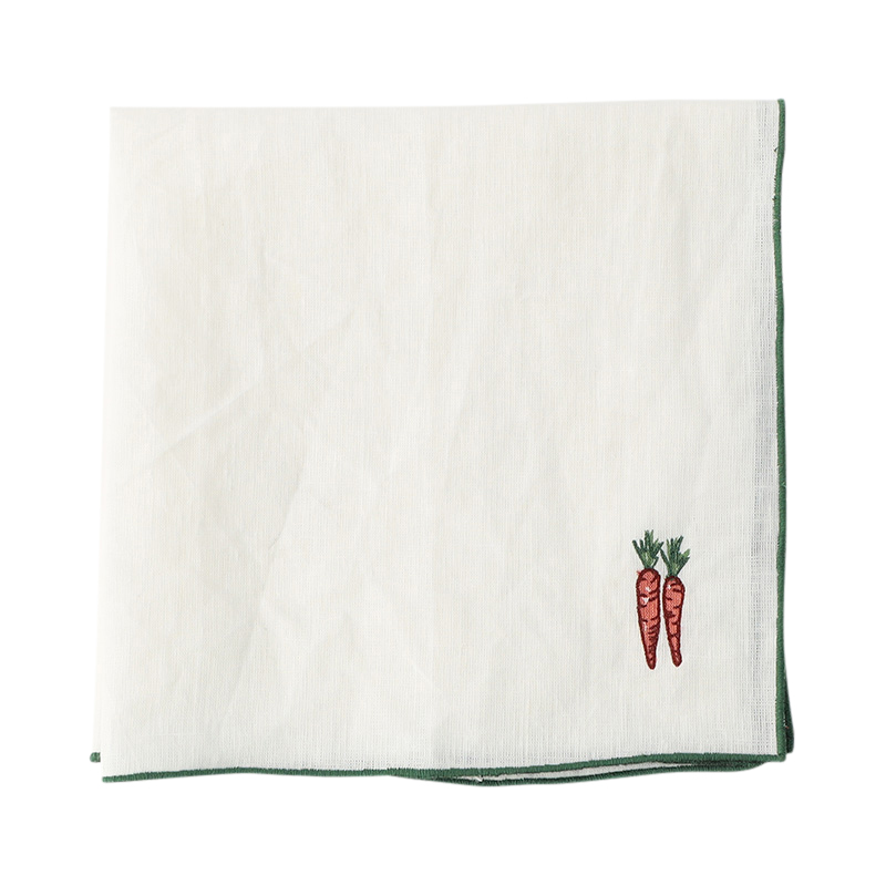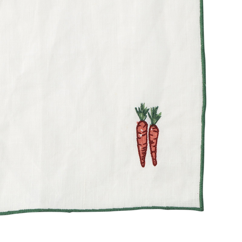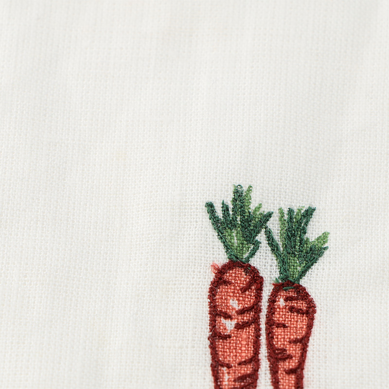 キャロットのモチーフが刺繍されたリネン100%のナプキンは、柔らかさと耐久性を兼ね備えており、カジュアルな食事にもおもてなしのディナーにもぴったりです。