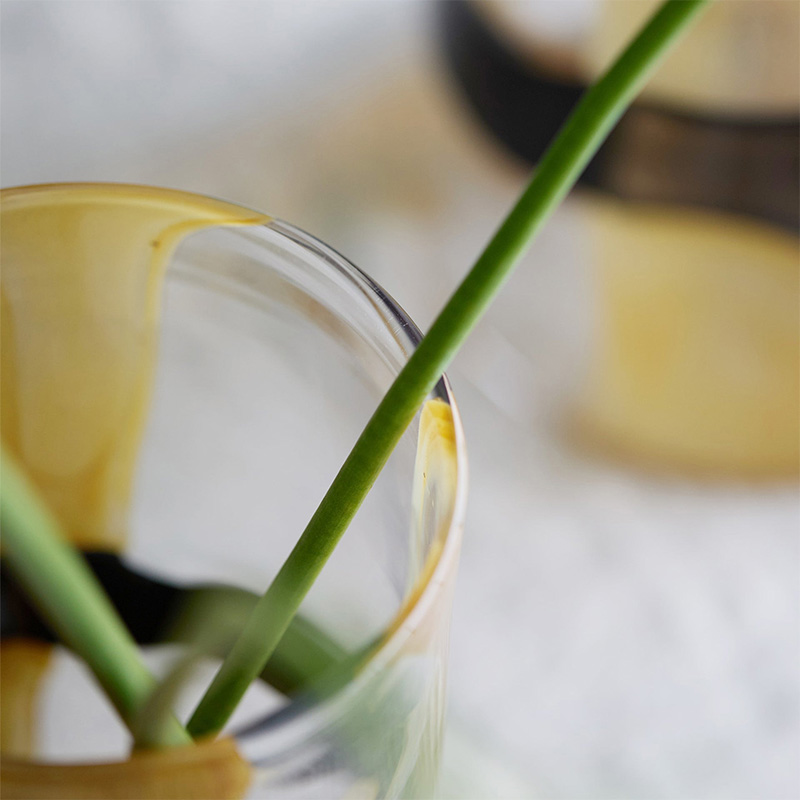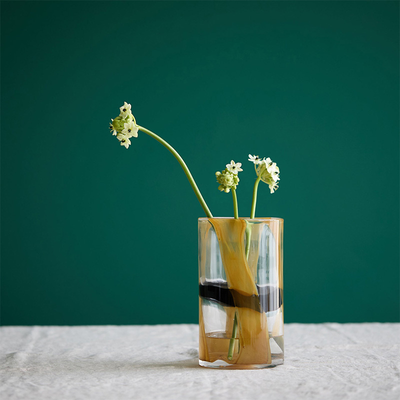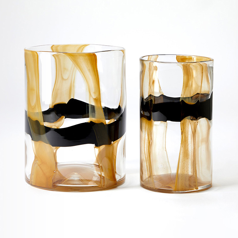 黒と黄色の絵の具のようなラインが、円柱型のベースに施され、ソフトで抽象的な質感を生み出しています。
