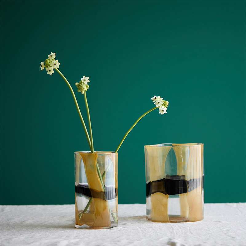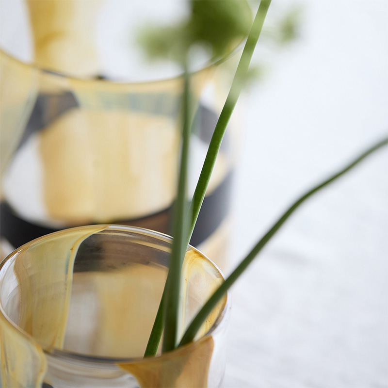 黒と黄色の絵の具のようなラインが、円柱型のベースに施され、ソフトで抽象的な質感を生み出しています。