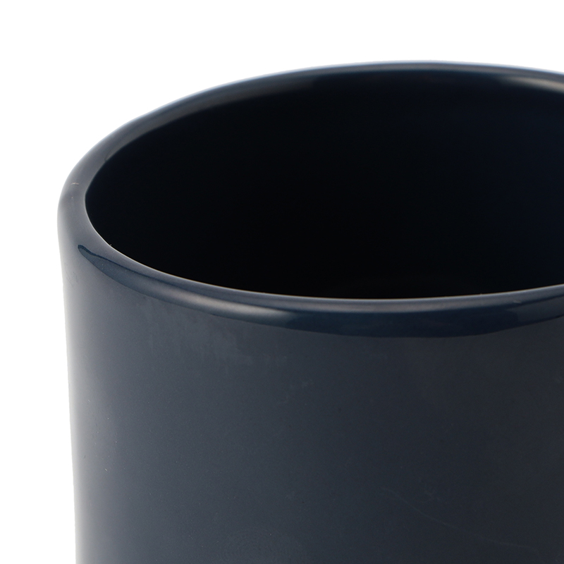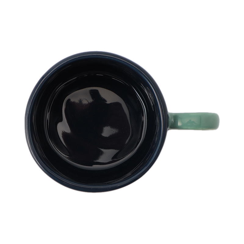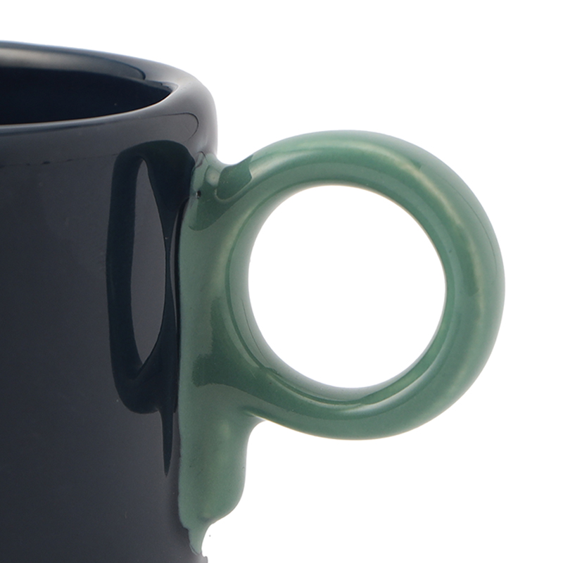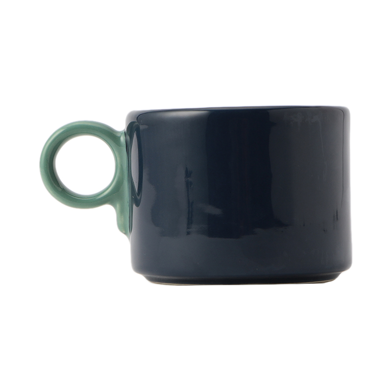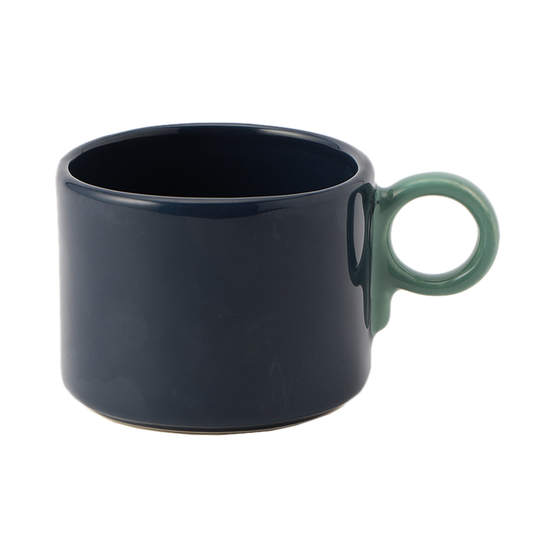 モダンな雰囲気のマグカップは、広めのカップに小さな丸い取っ手が取り付けられ、光沢のある釉薬で仕上げられています。