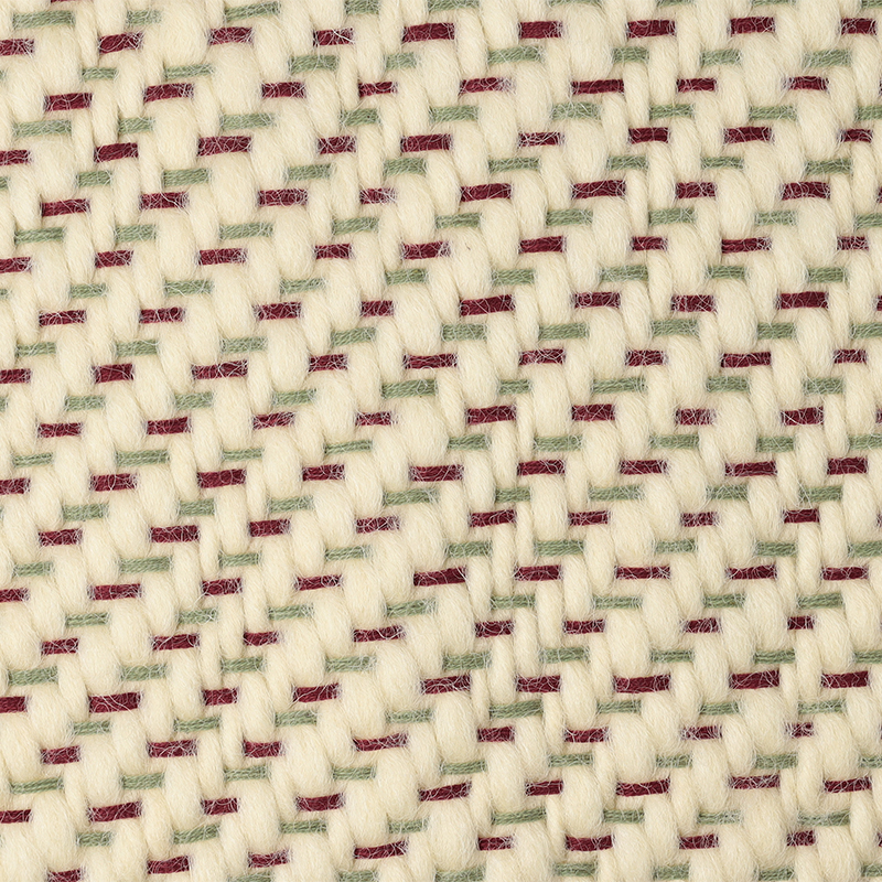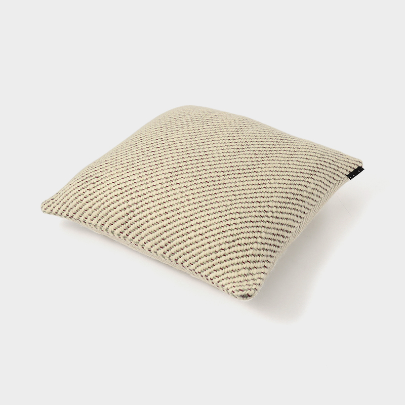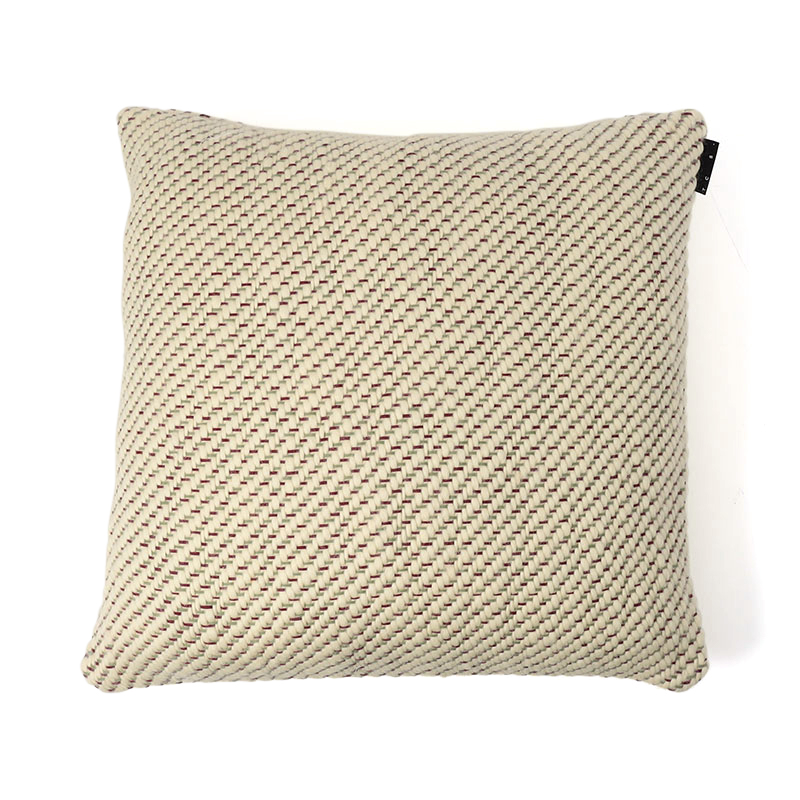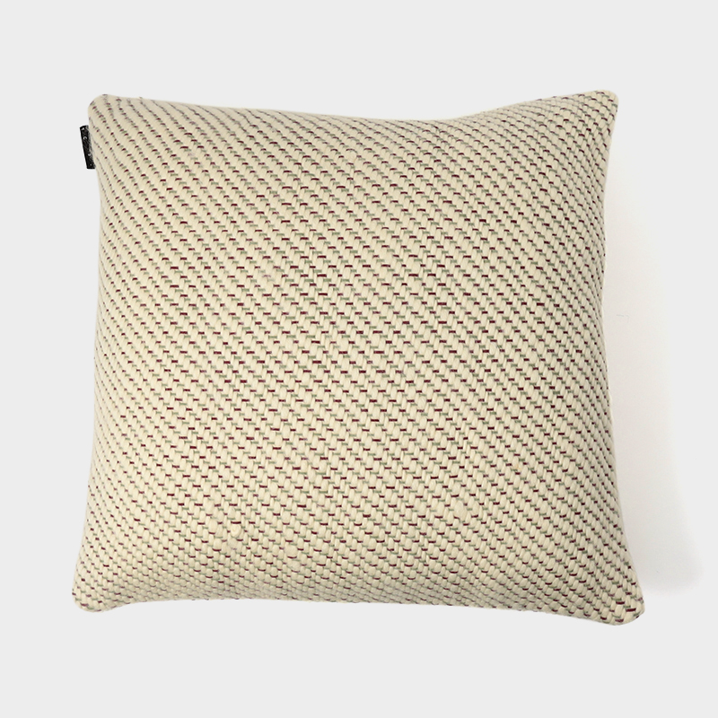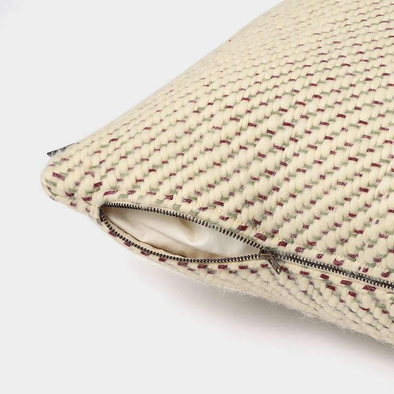 洗練されたクリーム色をベースに、リッチなワインレッドとオリーブの織り柄があしらわれ、温かさとスタイリッシュさが見事に調和した手織りのクッションカバーです。