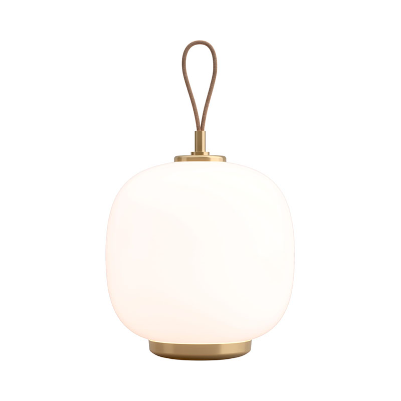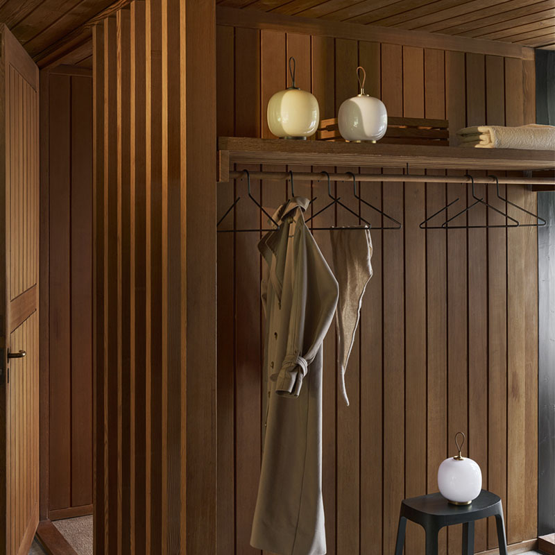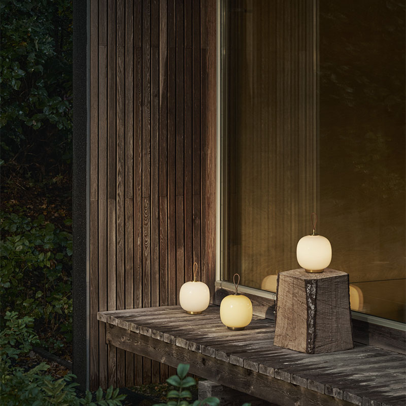 VL 45 ラジオハウス ペンダントをベースにした「VL 45 ラジオハウス ポータブルランプ」は、屋内外問わずどこでも持ち運びができ、クラシックなハンドメイドのオパールガラスが光と雰囲気を演出します。