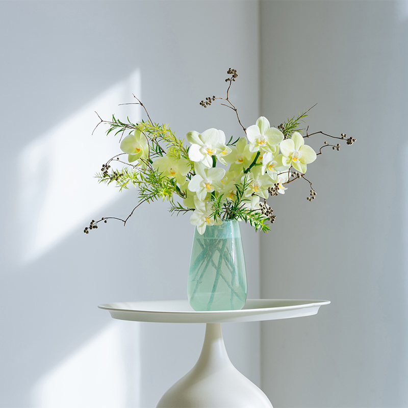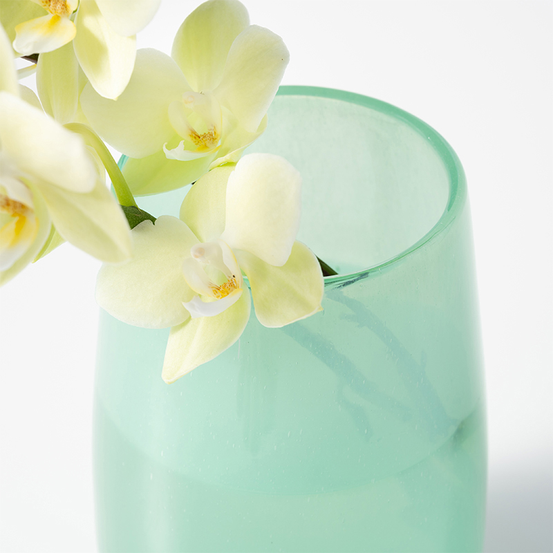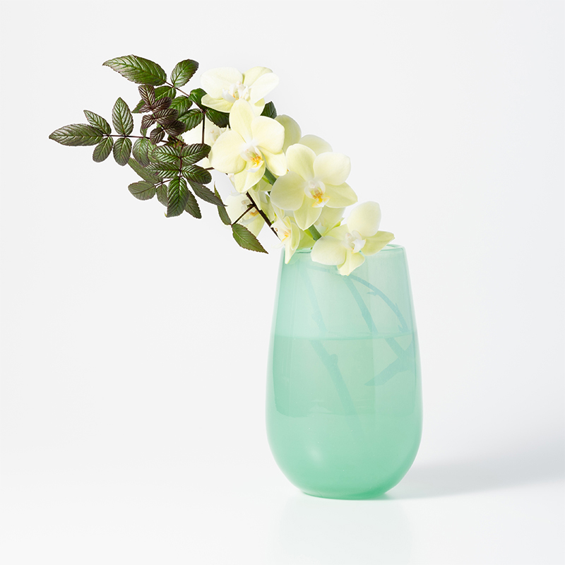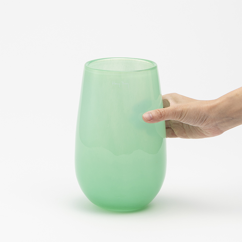 古くからガラス生産が盛んな東欧の工場で、熟練した職人たちの吹きガラス製法によってひとつひとつ丁寧に作られた花器は、手に取ると冷たいガラスの中にハンドメイドのあたたかな温もりが感じられます。