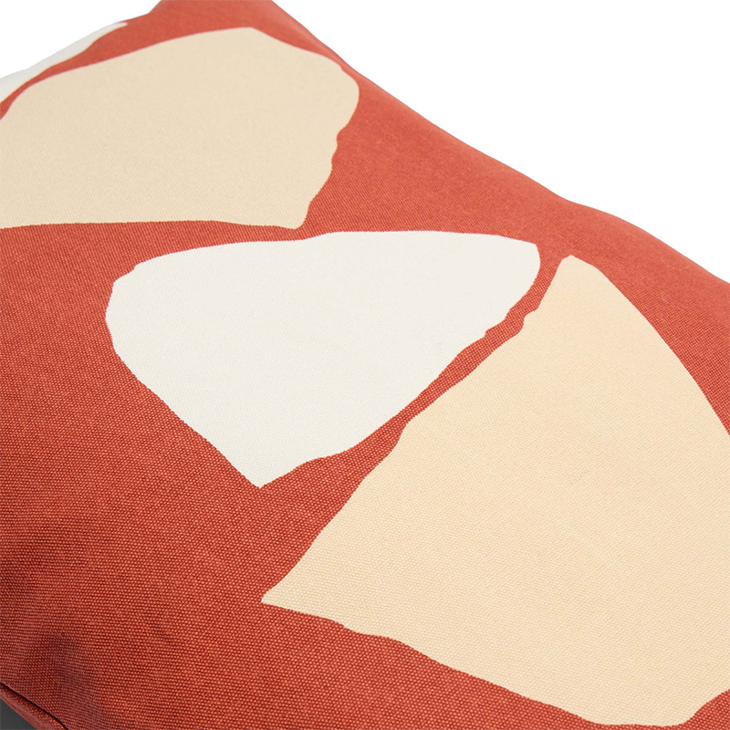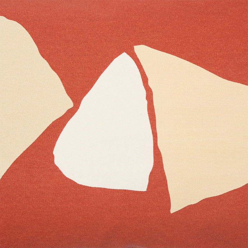 ダイナミックな抽象的タイル模様が、コットン100%の生地にプリントされています。深い赤と対照的な色使いが、壊れたようでありながら意図的に構成されたデザインを強調し、シェパードの創作過程における有機的なアプローチを反映しています。