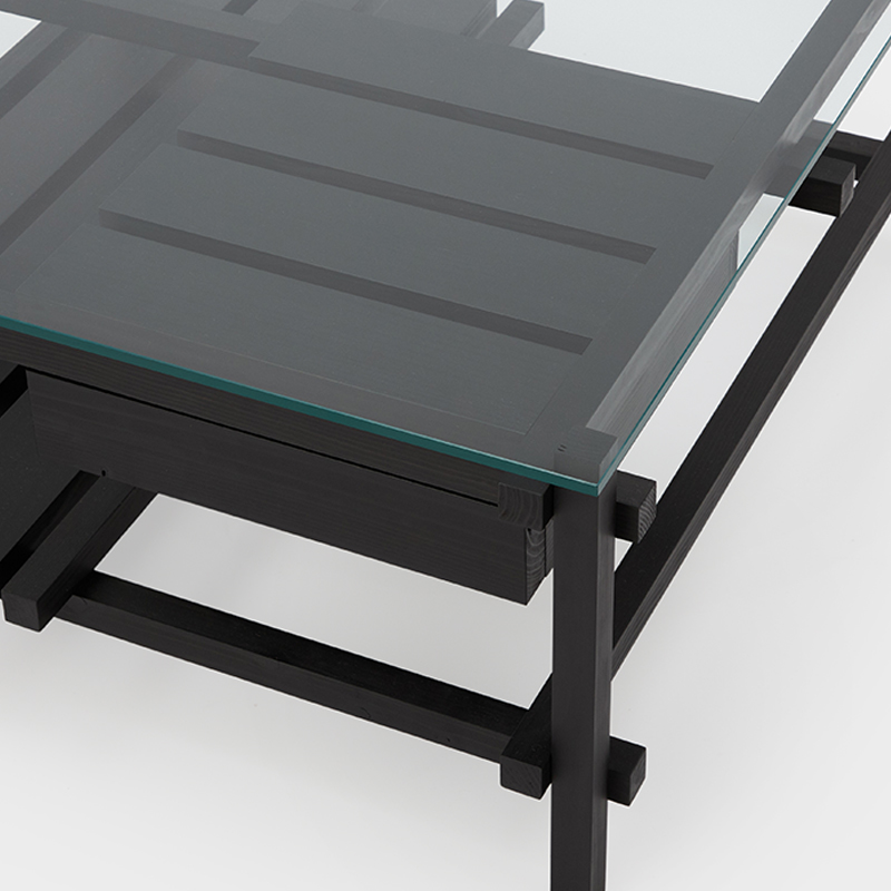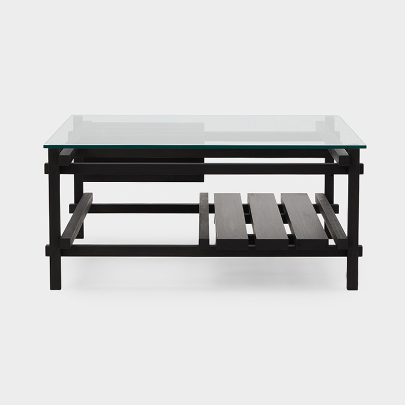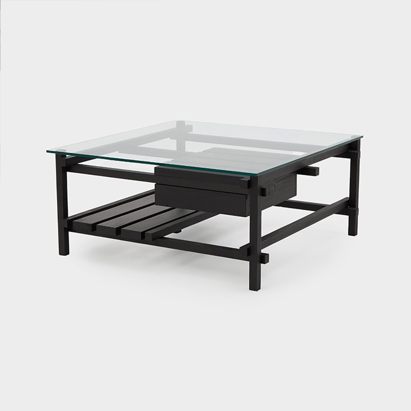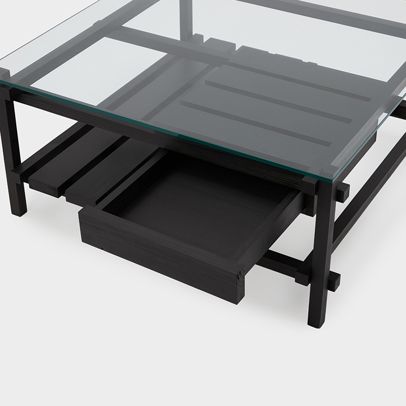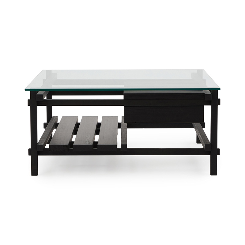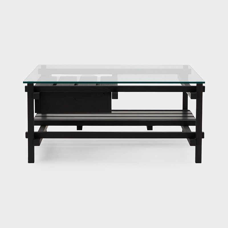 コーヒーテーブルは、棚板や引き出しの位置を、ライフスタイルに合わせて自在にレイアウトできる、機能性に優れたデザイン。