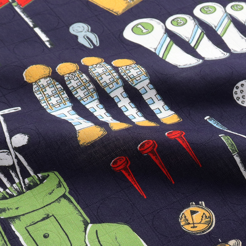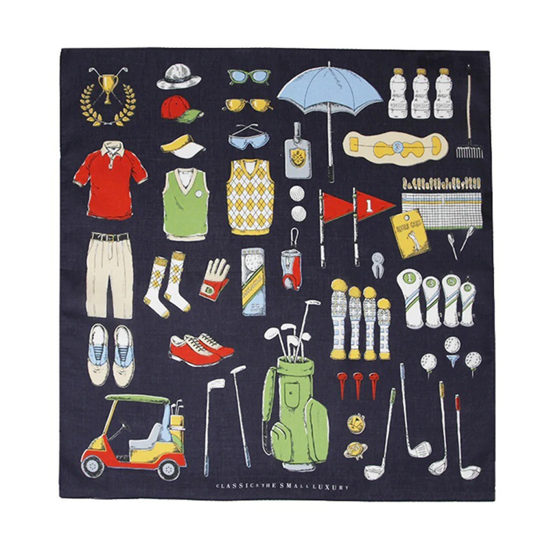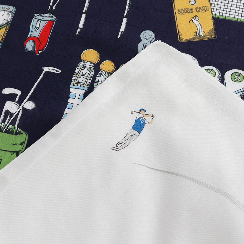 ゴルフクラブやゴルフボール。ゴルフカートにキャディバッグ、スコアカードなど。ゴルフにまつわる様々なアイテムが描かれたハンカチーフ。生地には、格子柄に織られたジャガード生地を使用。ハンカチーフの縁はミシンで細く縫製した千鳥巻きです。
