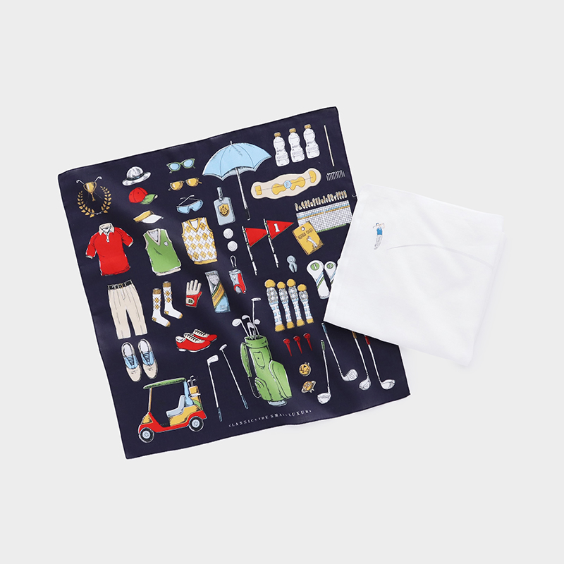 クラシクス・ザ・スモールラグジュアリは、1879年創業のブルーミング中西が2003年に立ち上げたハンカチ専門店。上質な素材と繊細な刺繍、美しいデザインにこだわり、企画から包装に至るまで丁寧に仕上げています。“ひそやかな贅沢”を一枚のハンカチに込めて、日常にそっと彩りと心地よさをお届けしています。ゴルフクラブやゴルフボール。ゴルフカートにキャディバッグ、スコアカードなど。ゴルフにまつわる様々なアイテムが描かれたハンカチーフ。生地には、格子柄に織られたジャガード生地を使用。ハンカチーフの縁はミシンで細く縫製した千鳥巻きです。