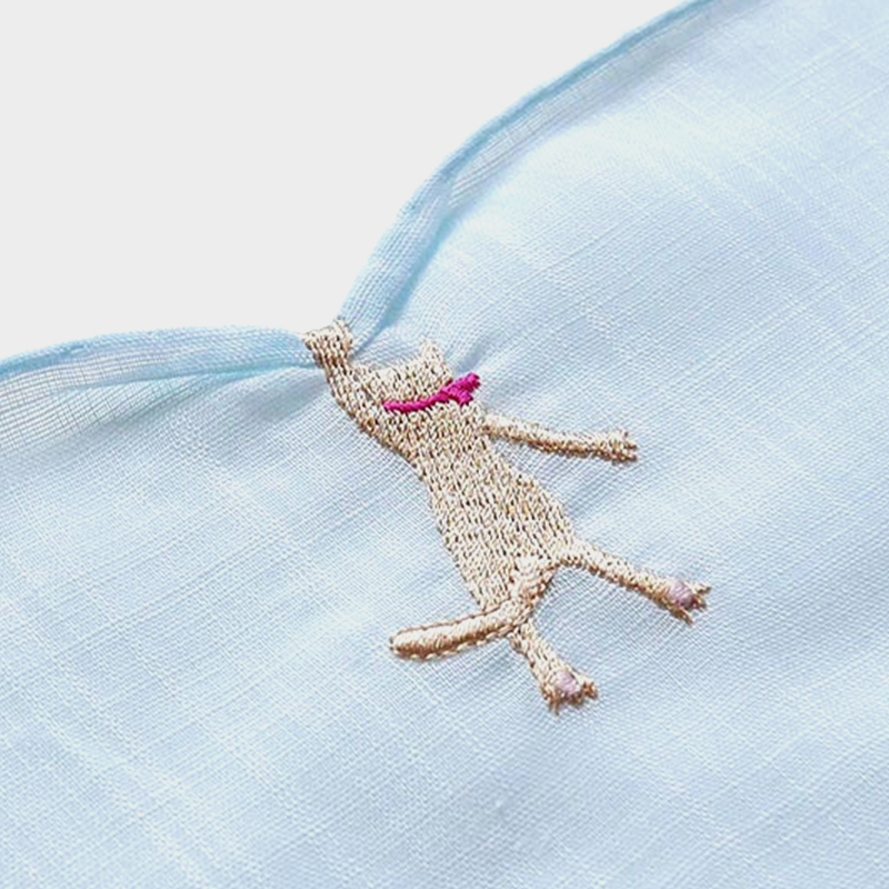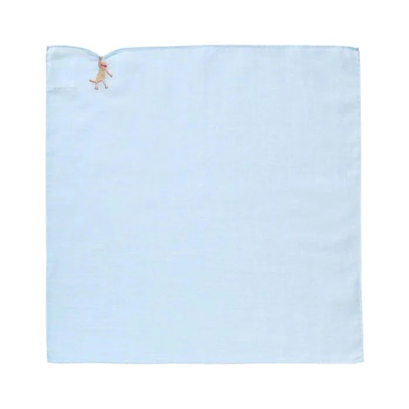 ハンカチーフの縁に猫が片手でぶら下がっているシーンを刺繍で表現。綿と麻で織られた生地は、綿の柔らかさと麻の自然なシャリ感の双方を感じることができます。