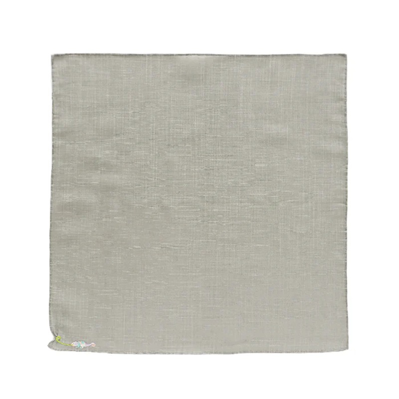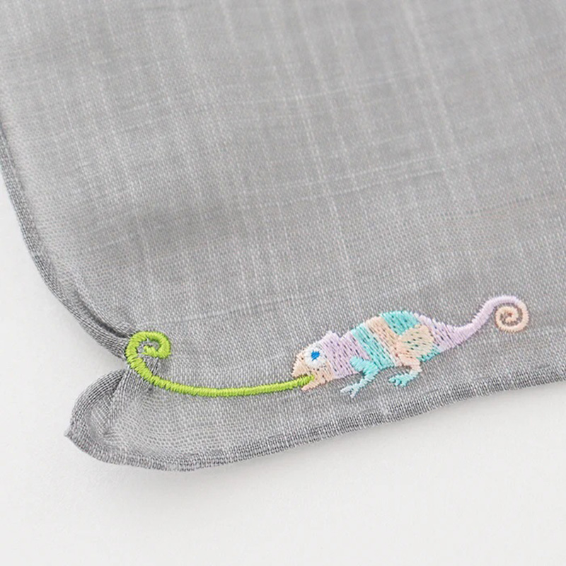 クラシクス・ザ・スモールラグジュアリは、1879年創業のブルーミング中西が2003年に立ち上げたハンカチ専門店。上質な素材と繊細な刺繍、美しいデザインにこだわり、企画から包装に至るまで丁寧に仕上げています。“ひそやかな贅沢”を一枚のハンカチに込めて、日常にそっと彩りと心地よさをお届けしています。ハンカチーフのふちを引っ張る可愛らしいカメレオン。