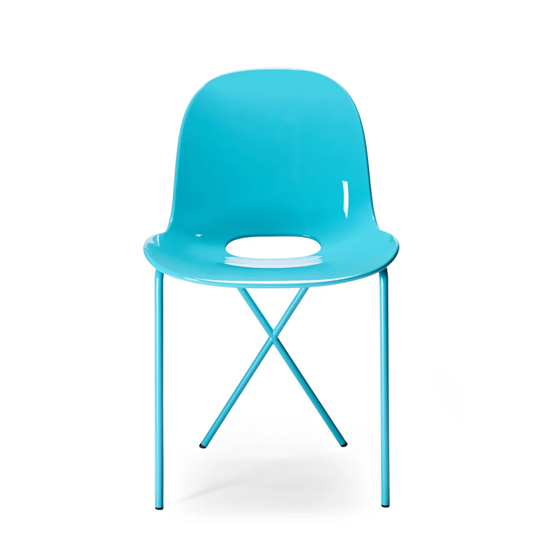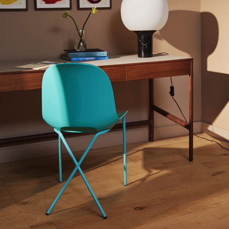 鮮やかな色彩が目を引く「Crossleg Side Chair Gloss」は、艶のあるシェルとマットな粉体塗装のスチール脚を組み合わせた、コントラストの効いた佇まいが印象的です。