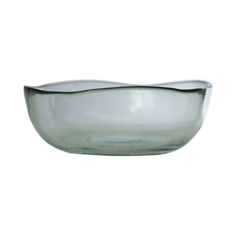 ボウルのフチが波のように揺らいだ、リサイクルガラスのボウル。再生ガラスの柔らかい色味と雰囲気に、ゆるい形がほどよくマッチして使いやすいボウルです。
