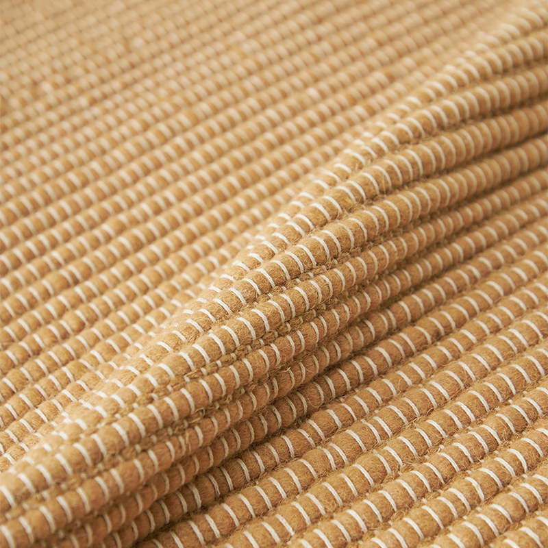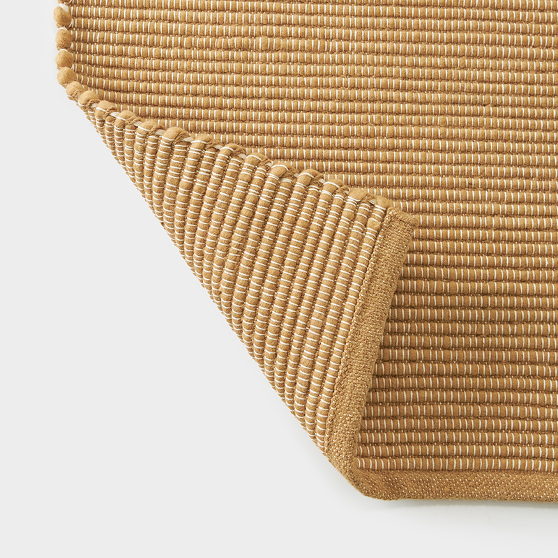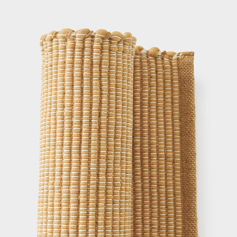 マーロンラグは、伝統的な織機で一つひとつ手織りされており、手仕事ならではの自然な風合いや個性が際立ちます。表情豊かなスラブ調の生地は、心地よい手触りと、リラックス感あふれるやさしい雰囲気を演出します。