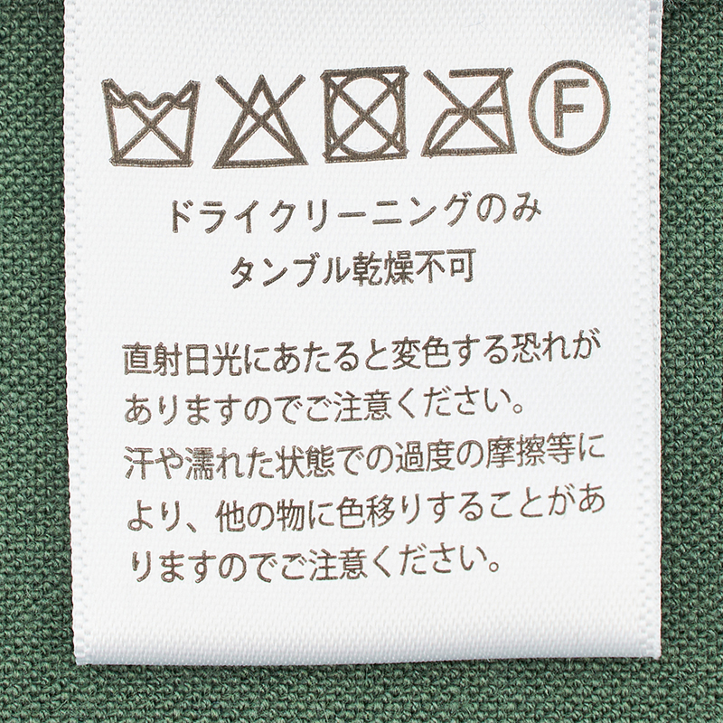 ドライクリーニングのみ、直射日光は変色の恐れがあるためお避け下さい。