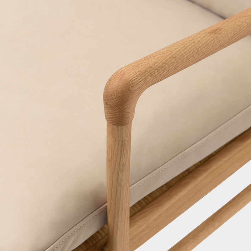 特徴的なアームは滑らかな曲線を描き、先端で真下にカーブするヴァンシャーらしい意匠です。丸棒状の前脚と、若干カーブさせた後脚が椅子に安定性を与え、優雅な傾斜のあるシルエットを作り出しています。