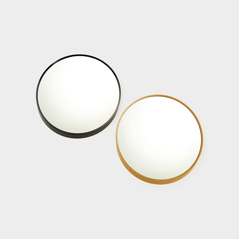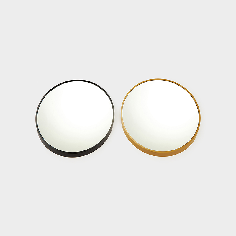 光沢のあるラッカー仕上げのフレームは立体的な斜角デザインが特徴で、360度回転が可能。8つの吊り下げ一から異なる角度で楽しめる、ユニークで多面的な表情を持つミラーです。