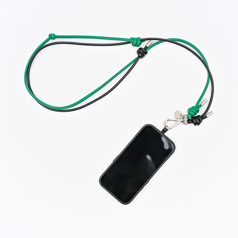 ミニマルなデザイン性を崩さずに使用するシーンを想定した機能を入れ込むことで、ファッショナブルでありながら、見た目では想像のつかない使い勝手を持つ。使用するたびにのめり込むような中毒性を持ったアイテムに仕上がるよう心かけており、オリジナルのファスナープルトップや他とは違う独特なサイズ感など、全てにおいてこの考えが反映されています。さらに、ノベルティとしてスマートフォン取り付け用のパーツが付属しています。このフォンストリングは、スマートフォンや携帯電話だけでなく、小ぶりなポーチや鍵なども取り付け可能なマルチストラップとして使用できます。ファッションと実用性を兼ね備えたこのフォンストリングは、日常の忙しいライフスタイルにおいて、お手持ちのアイテムをスタイリッシュに持ち運ぶのに最適です。さまざまな用途で活躍することで、さらなる便利さとスタイルを提供します。"ロックミシンで緻密なステッチが施された、太さ5mmの丸レザー紐を使用したフォンストリング。