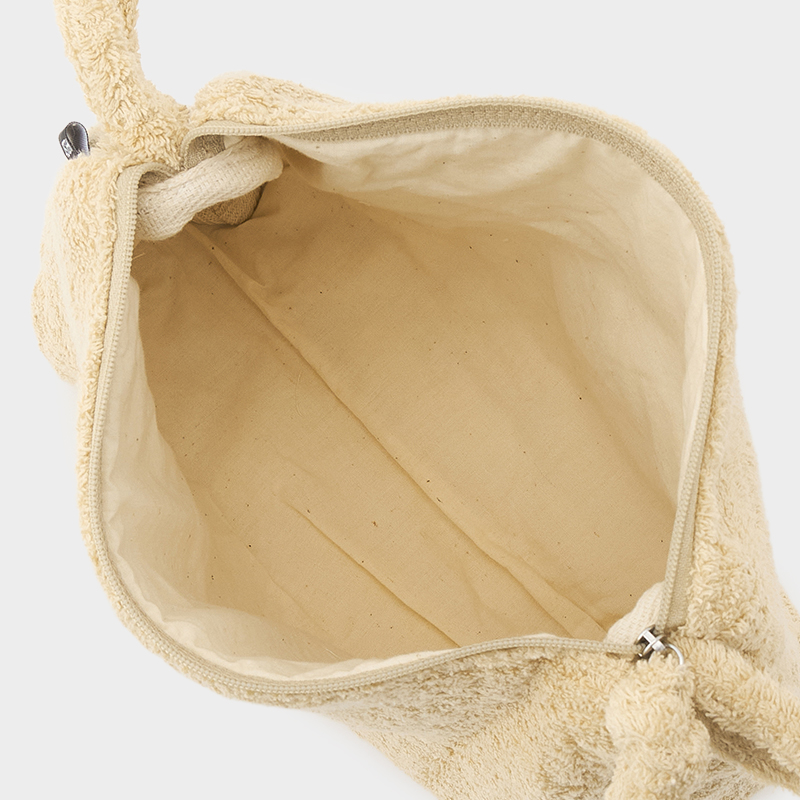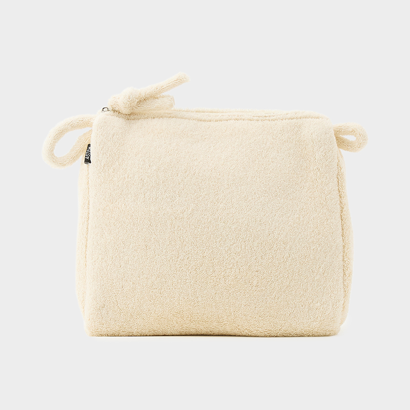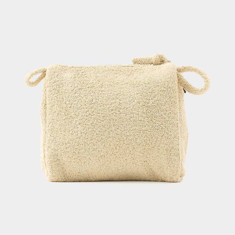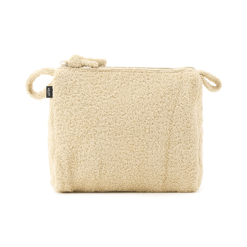 柔らかなテリー素材のポーチ。クラシックなデザインのトイレタリーバッグは、耐久性のあるジッパーで中身をしっかり守ります。柔らかなテリー素材は手触りもよく、日常使いに最適です。三角形のフォルムは収納力と使いやすさを兼ね備えており、メイクやトイレタリー用品の収納や、小物入れとしても活躍します。