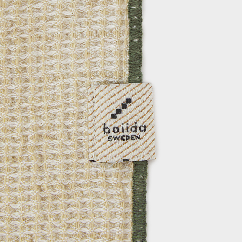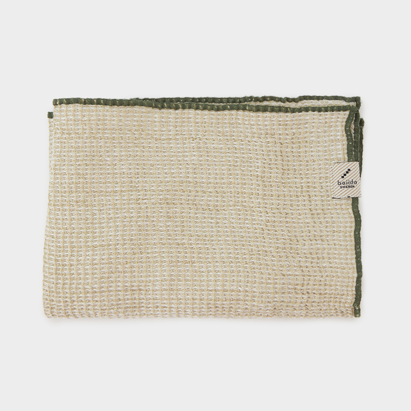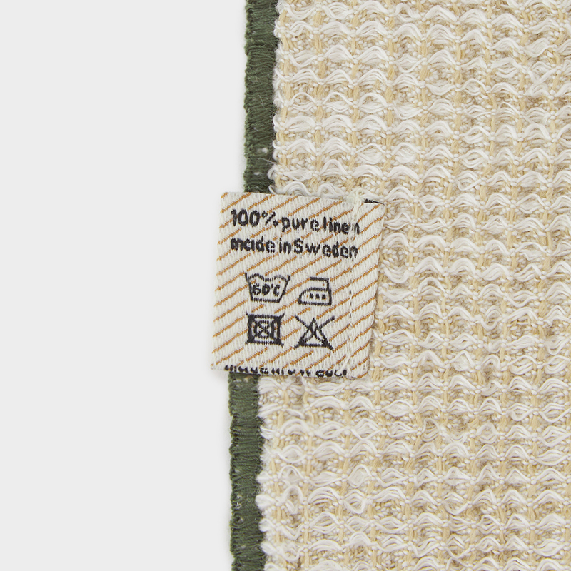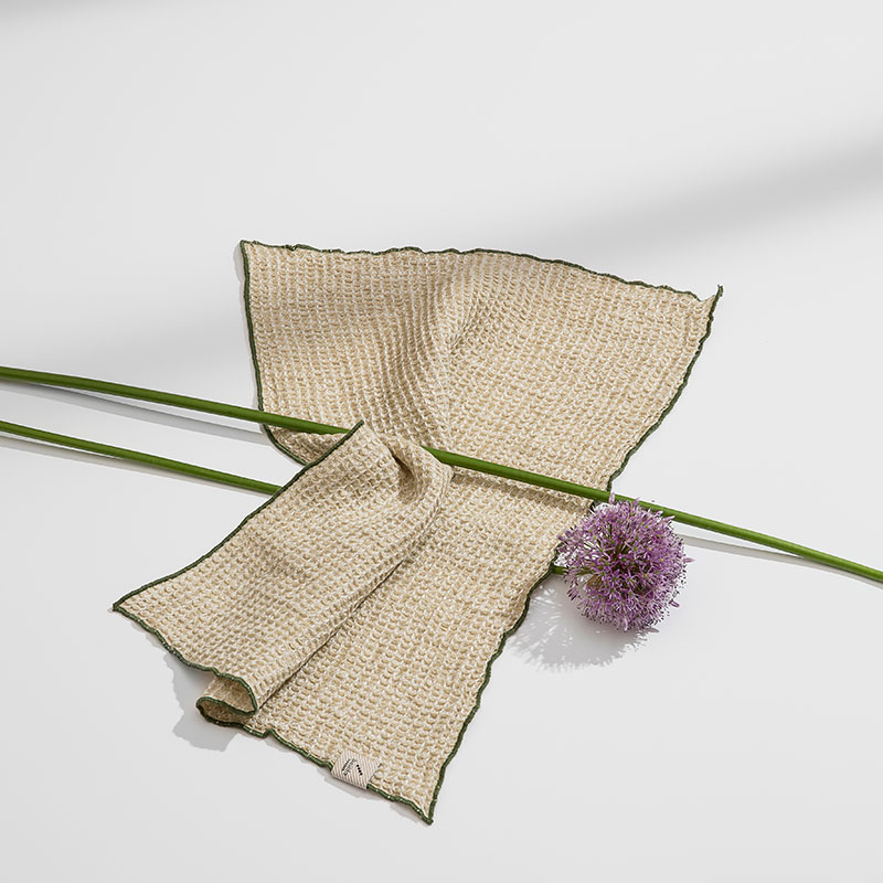 素材にヨーロッパ産のリネンを使用し、糸は世界に誇る高い品質で知られるスウェーデン王室御用達の名門織物工場で紡がれています。糸づくりの段階から丁寧にデザインされたティータオルは、使うほどに風合いが増し、キッチンに心地よい彩りを添えてくれる、日常に小さな楽しみをもたらす存在です。
