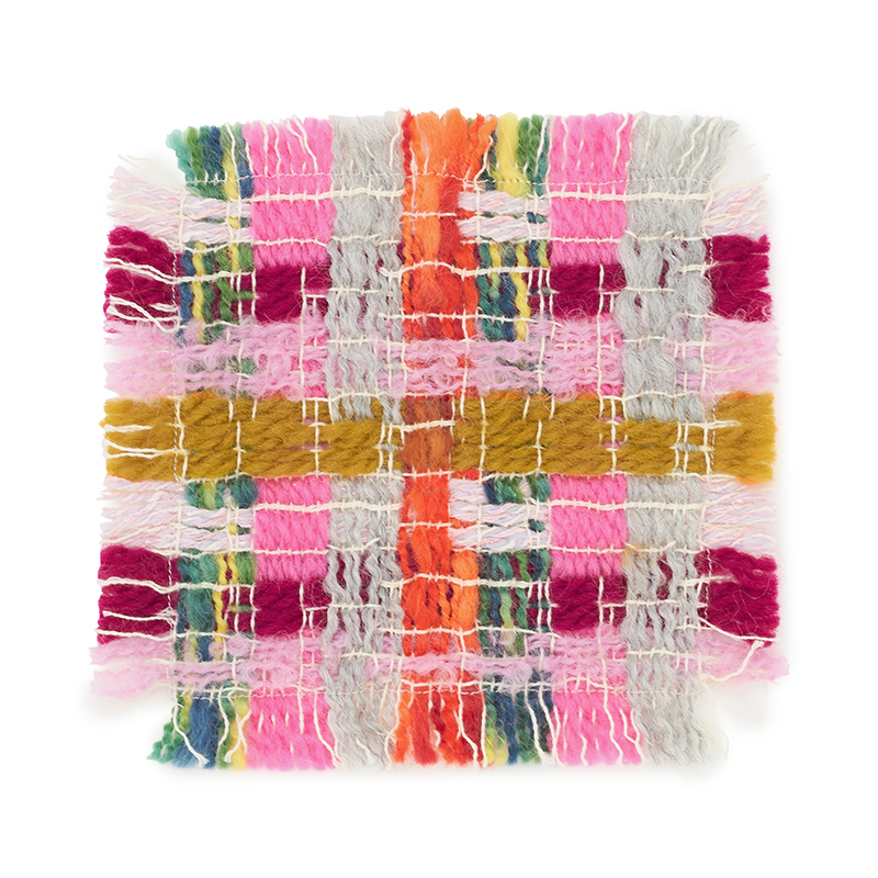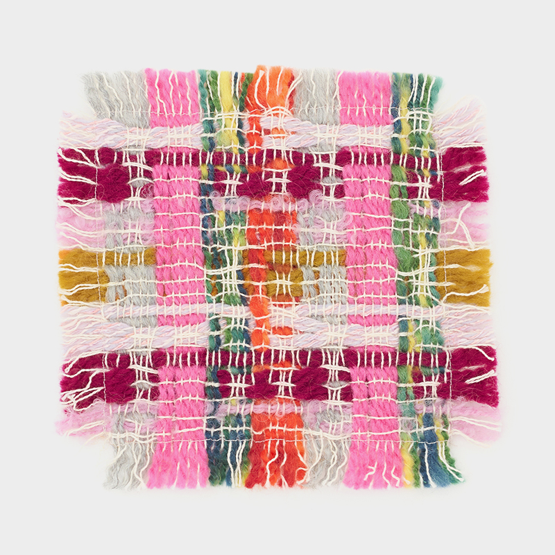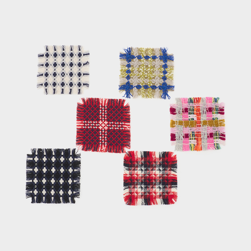 設計図からは計算しつくせない偶然性も、生地がもつ可能性だと考え、できあがった生地は服や暮らしの道具、インテリアなどさまざまなものへと形を変えていきます。Kijinokanoseiのコースター。