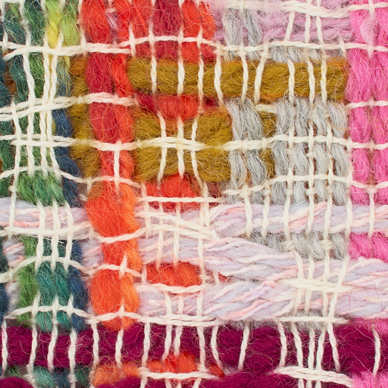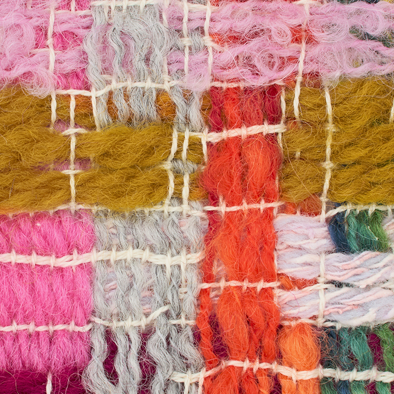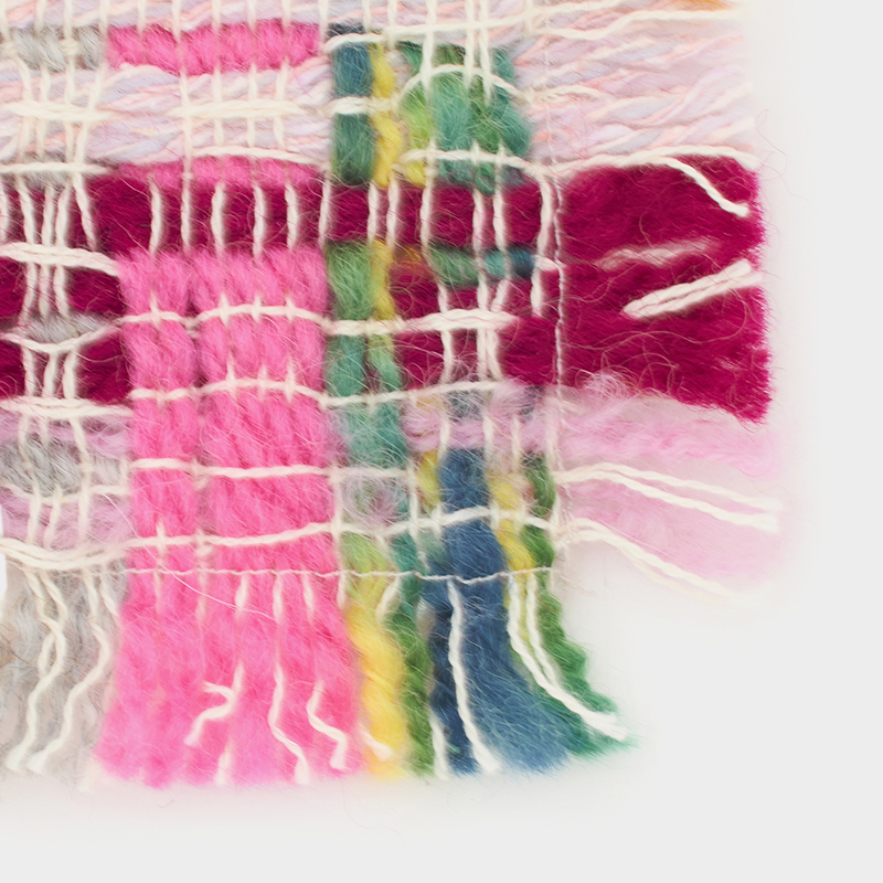 薄いラベンダーの糸はウールとシルクの糸を 5本撚り合わせて1本の糸に仕上げています。