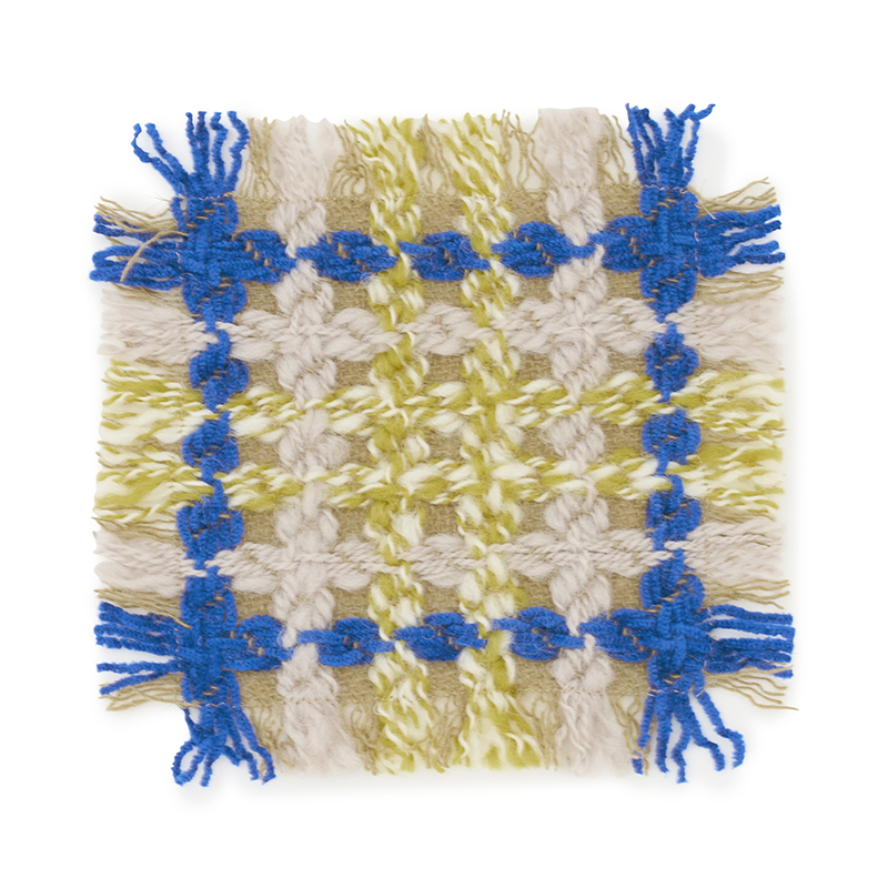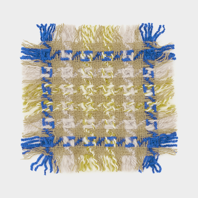 設計図からは計算しつくせない偶然性も、生地がもつ可能性だと考え、できあがった生地は服や暮らしの道具、インテリアなどさまざまなものへと形を変えていきます。Kijinokanoseiのコースター。