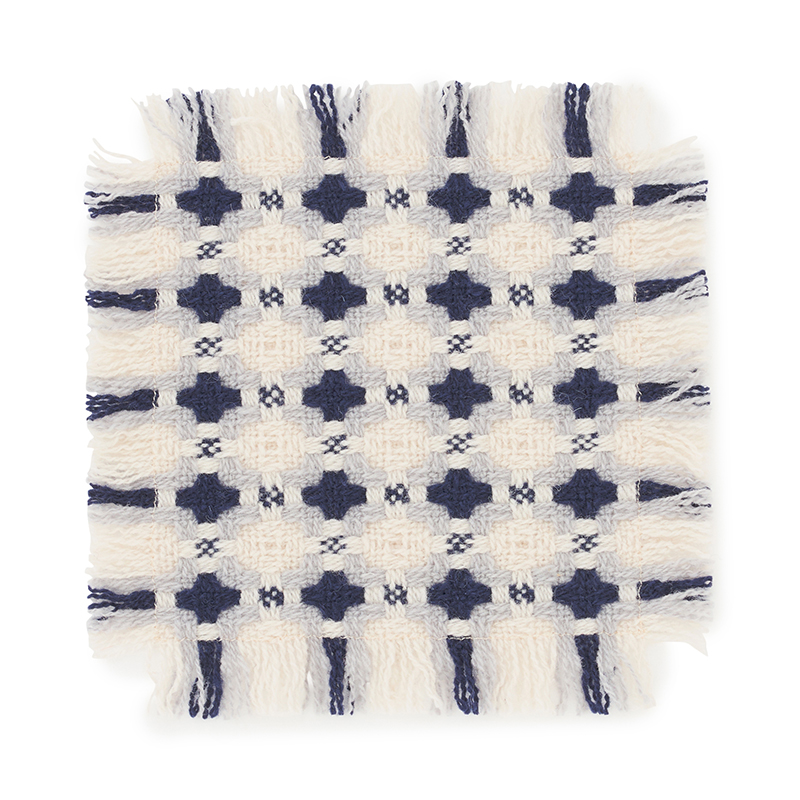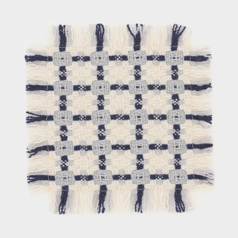 設計図からは計算しつくせない偶然性も、生地がもつ可能性だと考え、できあがった生地は服や暮らしの道具、インテリアなどさまざまなものへと形を変えていきます。Kijinokanoseiのコースター。