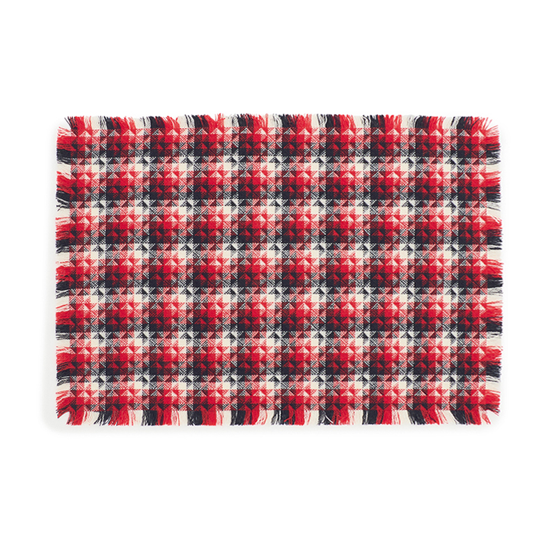 設計図からは計算しつくせない偶然性も、生地がもつ可能性だと考え、できあがった生地は服や暮らしの道具、インテリアなどさまざまなものへと形を変えていきます。Kijinokanoseiのプレイスマット。