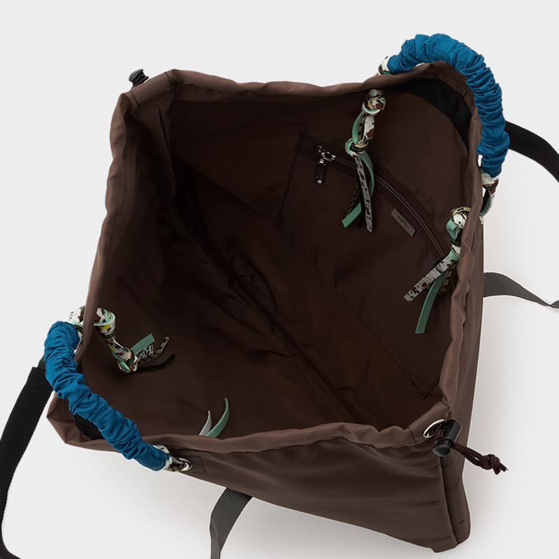 軽量でハリのあるナイロンを使用し、コードとマイクロファイバースエードを束ねたハンドルと肩掛け用のテープショルダーが付いた2WAYトートバッグ。