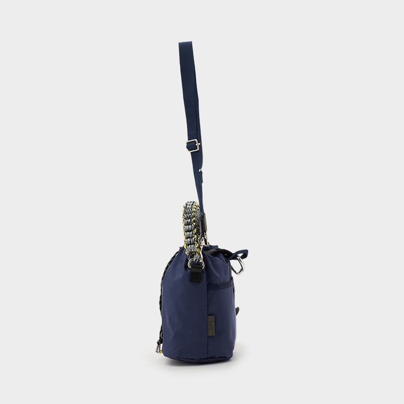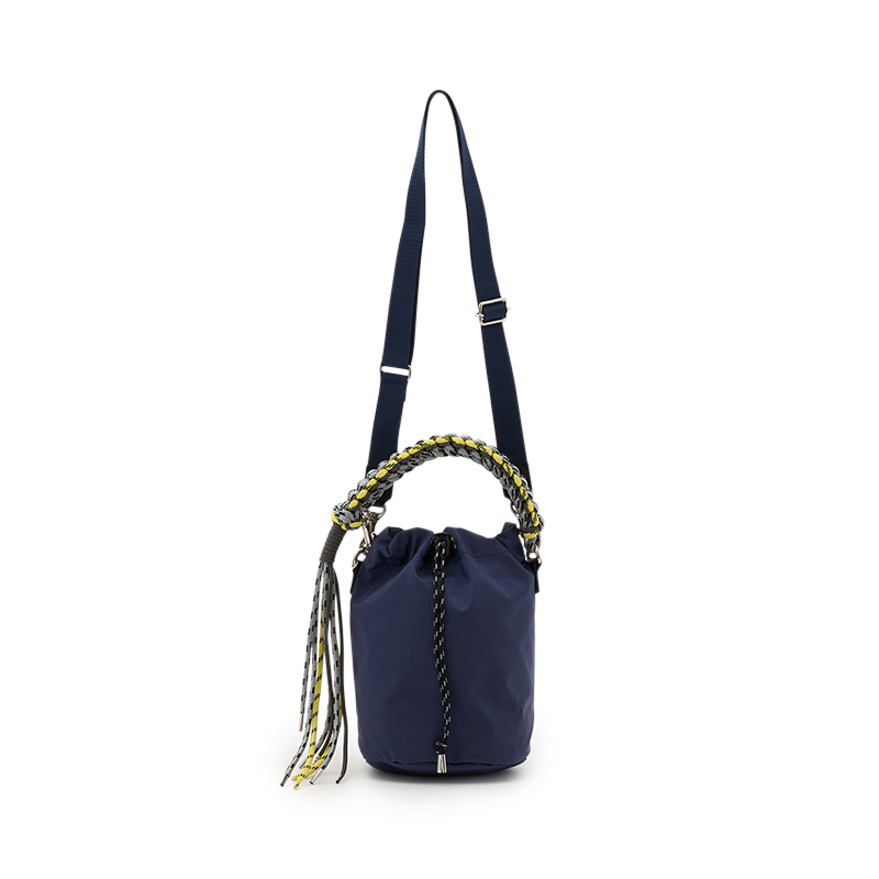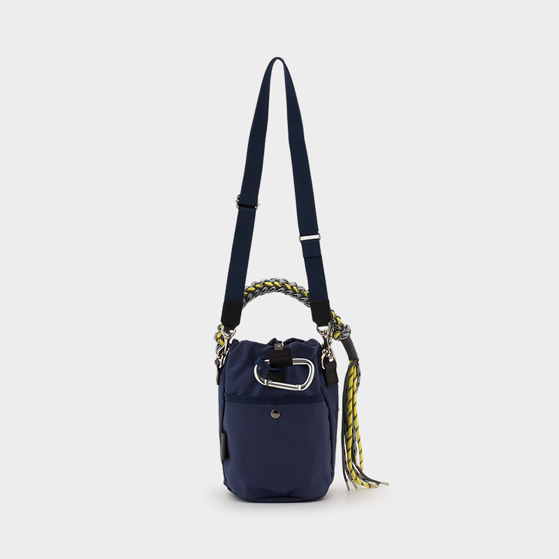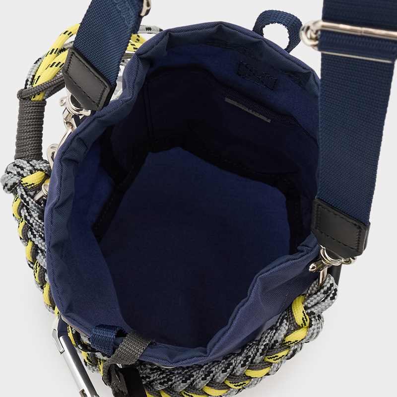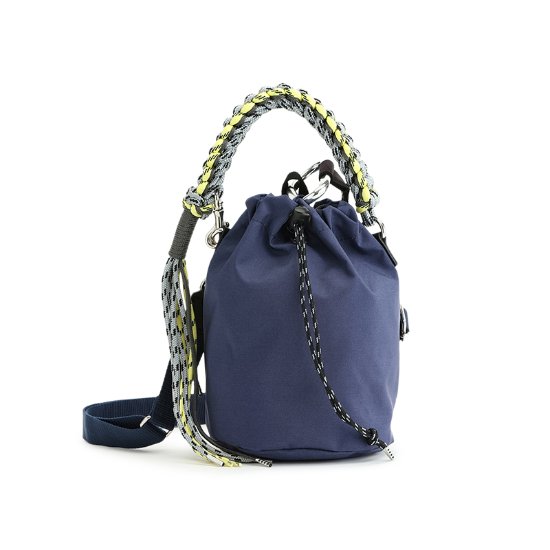 タフで軽量、マット感のあるナイロンを使用し、カラフルなコードで編んだハンドルが特徴的な巾着型スモールショルダー。