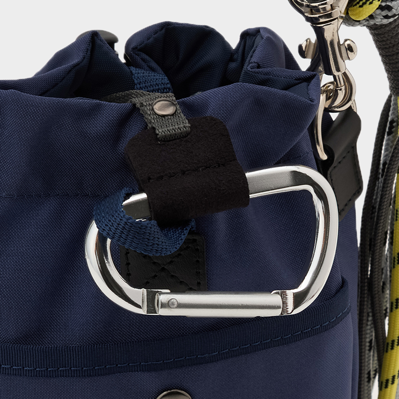 上部の開閉口に付いた大きなカラビナは、背面のループに通すことでロック機能になります。