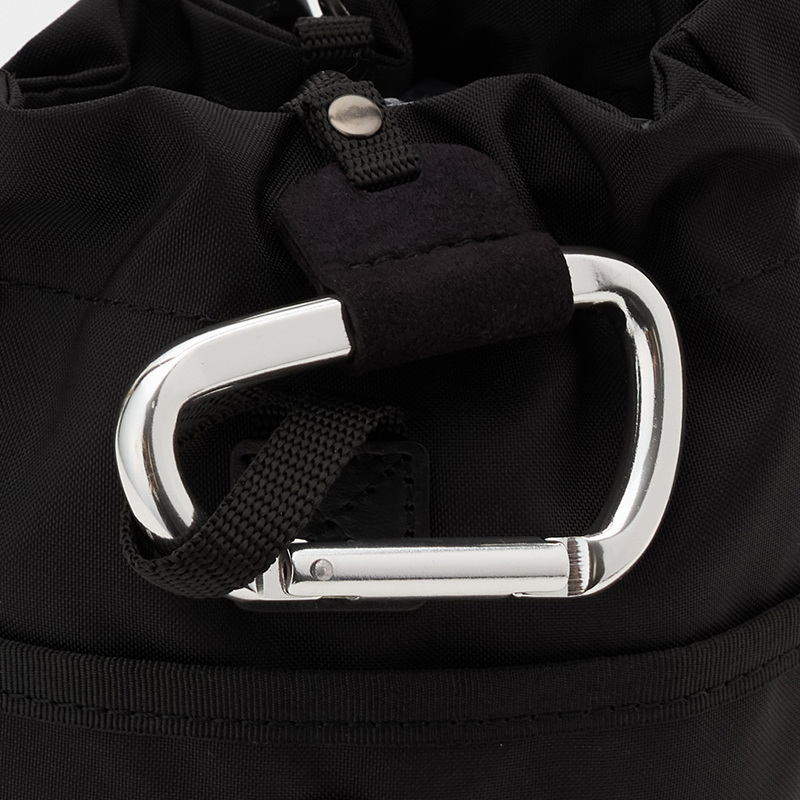 上部の開閉口に付いた大きなカラビナは、背面のループに通すことでロック機能になります。