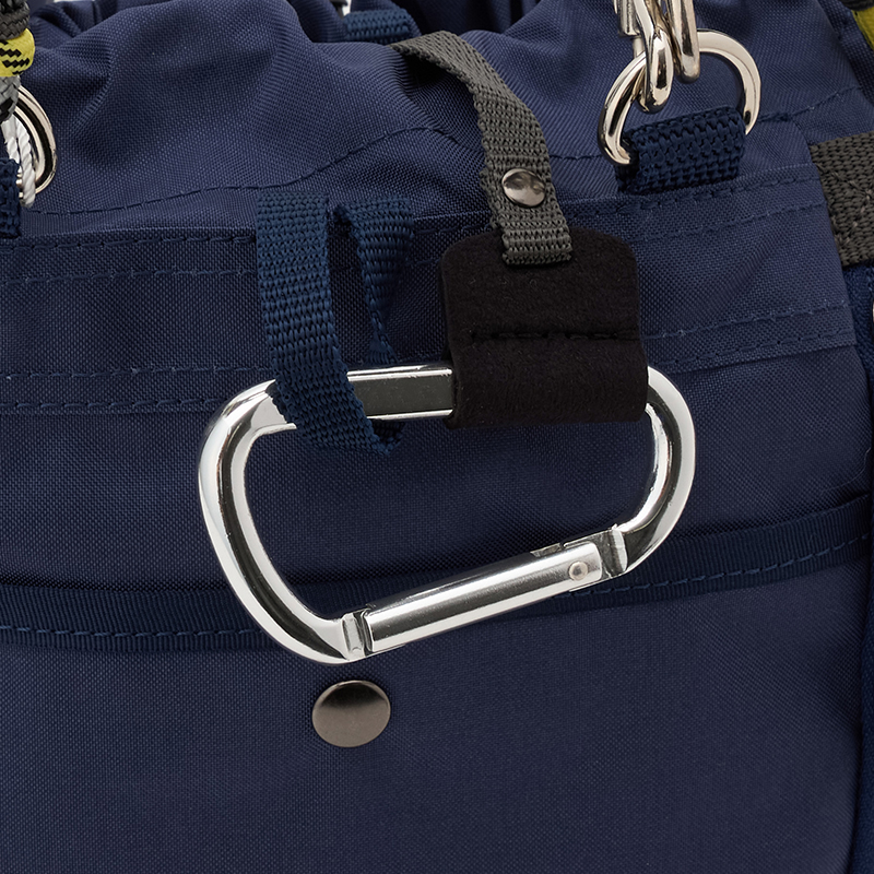 上部の開閉口に付いた大きなカラビナは、背面のループに通すことでロック機能になります。