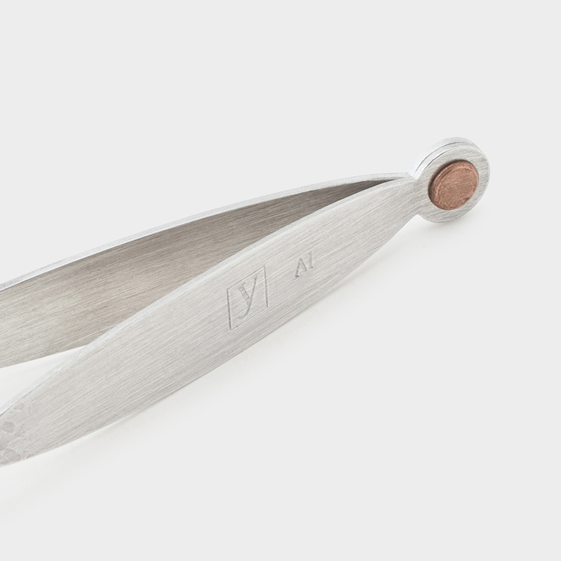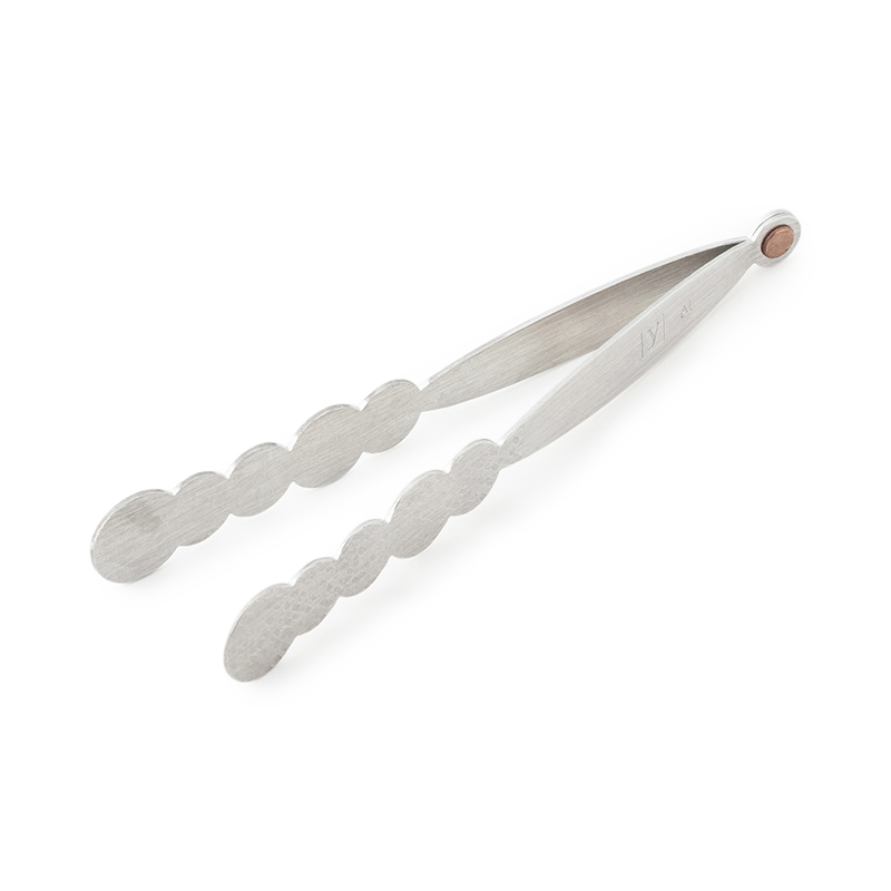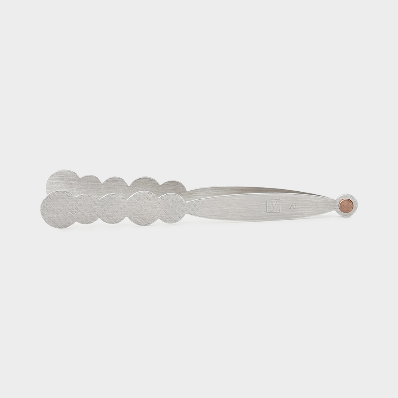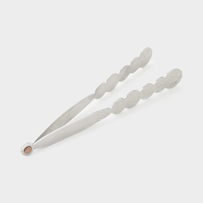 韓国・新羅時代の金冠に見られる造形美から影響を受けた彼女の作品は、常に「揺らぎ」を前提として制作されています。それは、時の流れの中で生きる生命の姿にも通じるものです。フォルムが特徴的なアルミ製のトング。