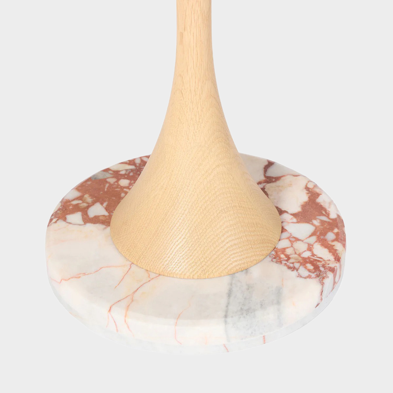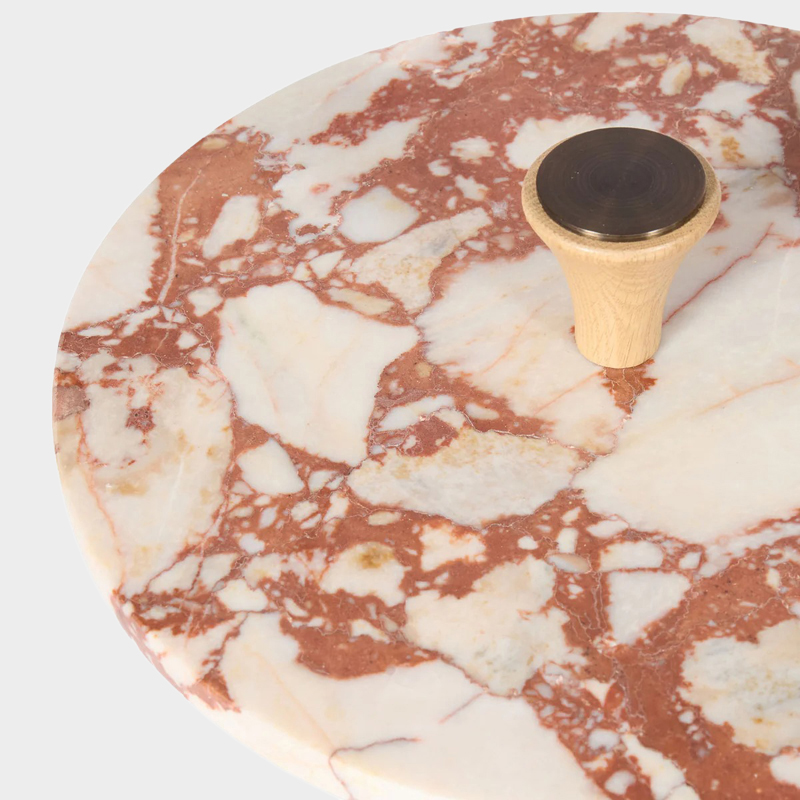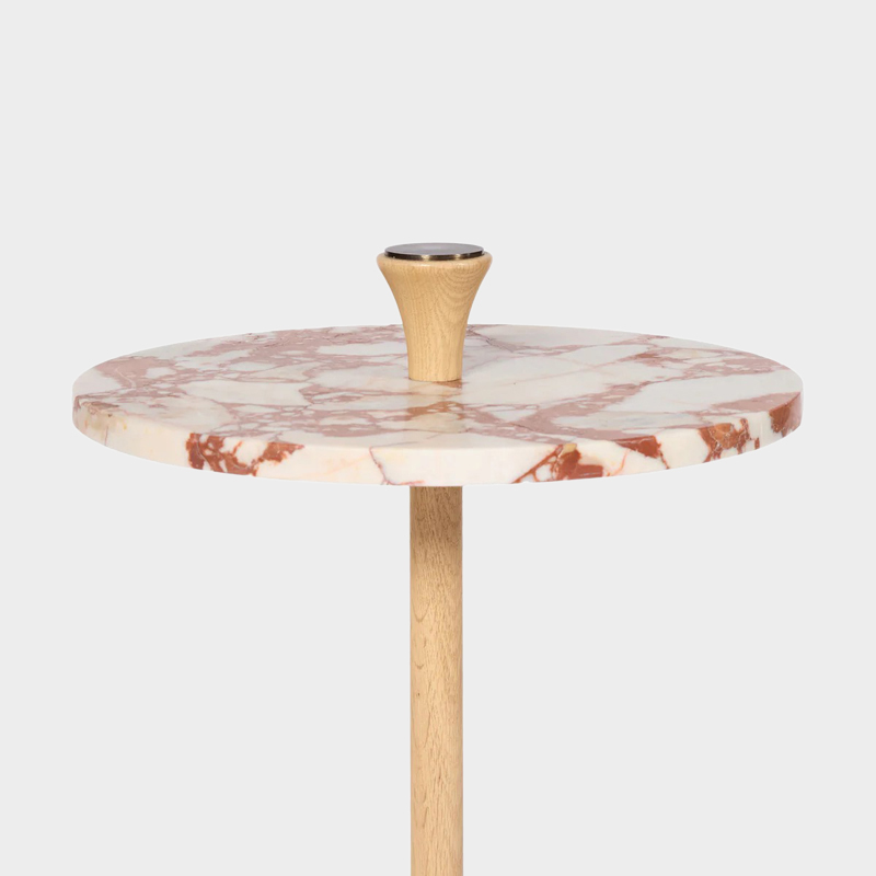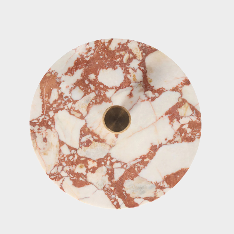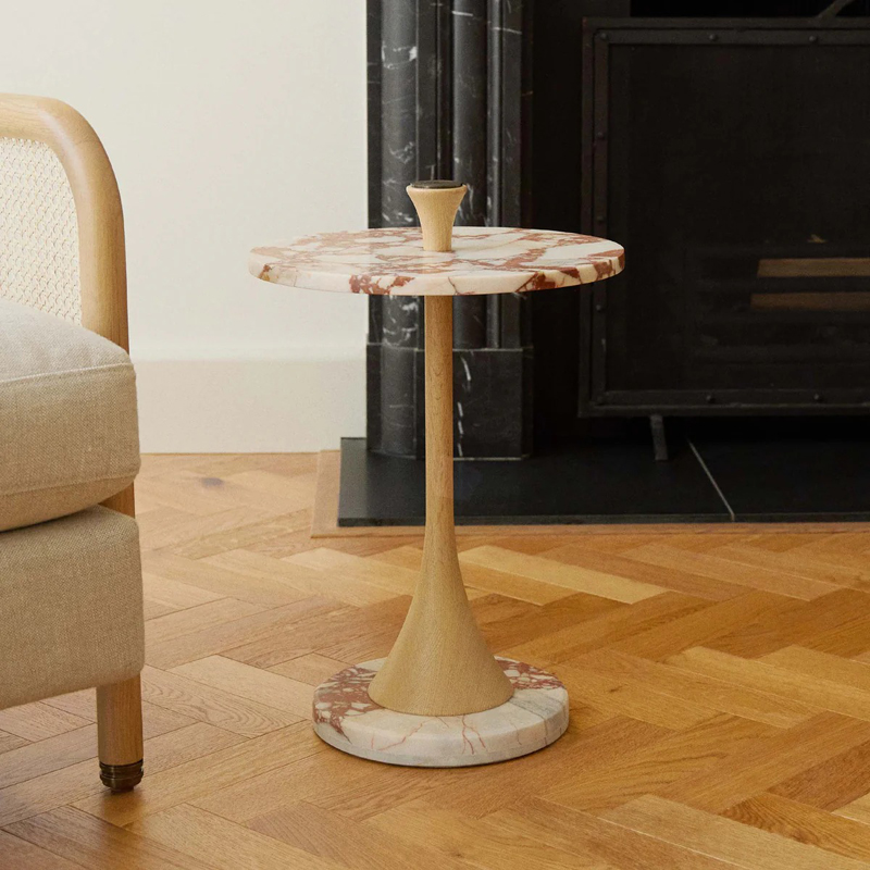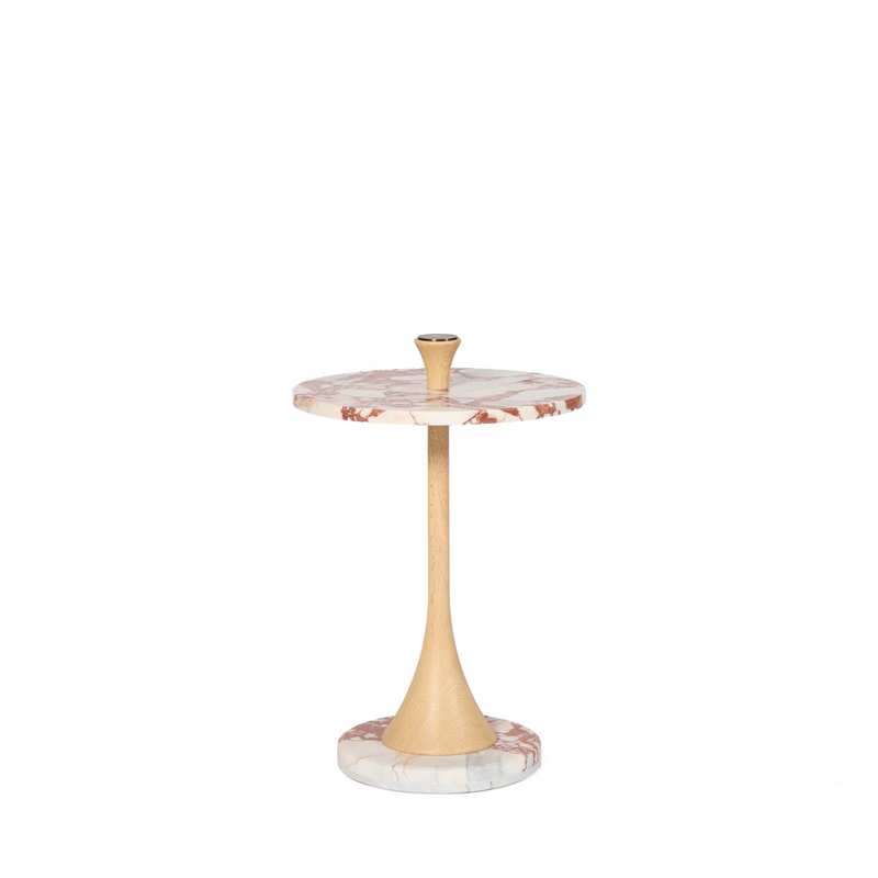 サイドテーブルには、深みのある色合いが魅力のブルガリ レッドの大理石を使用し、自然の風合いを生かしたホーニング仕上げが施されています。