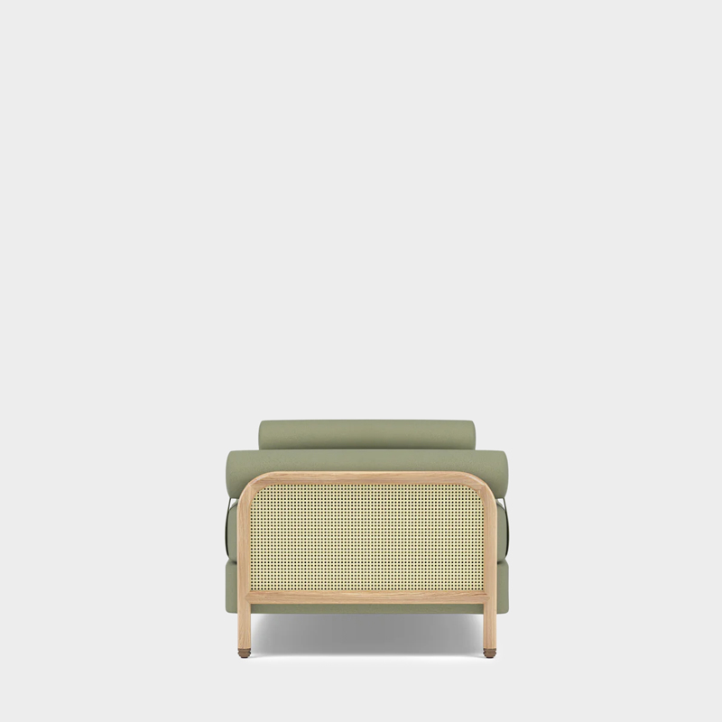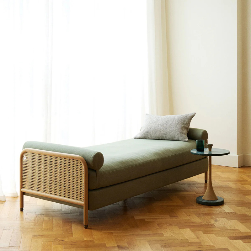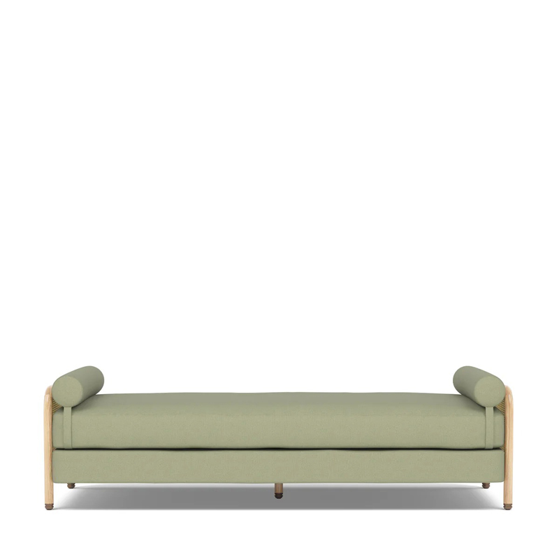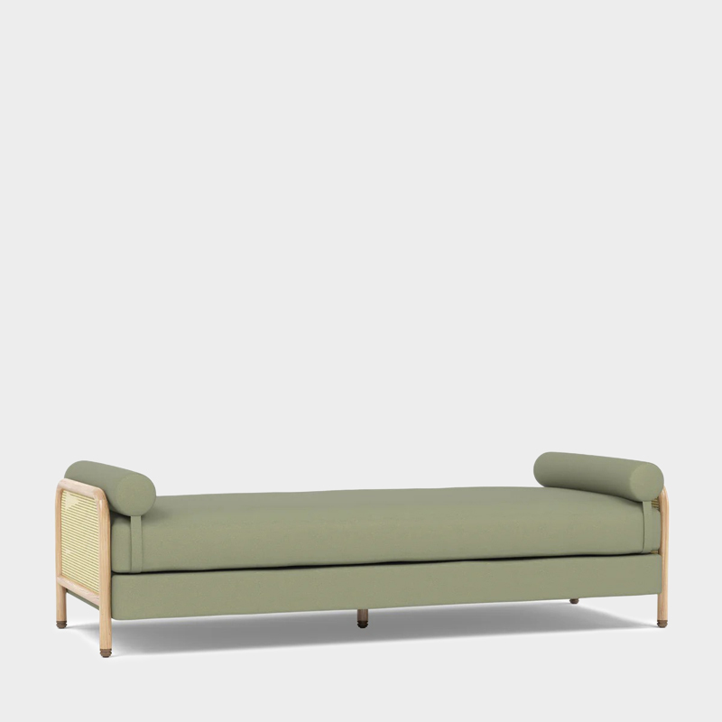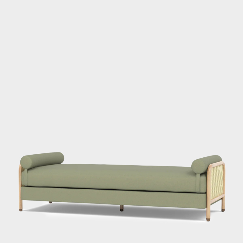 デイベットは、ソリッドオークのフレームにラタンのサイドパネルを組み合わせ、張地にはベルギーリネンを採用して作られました。