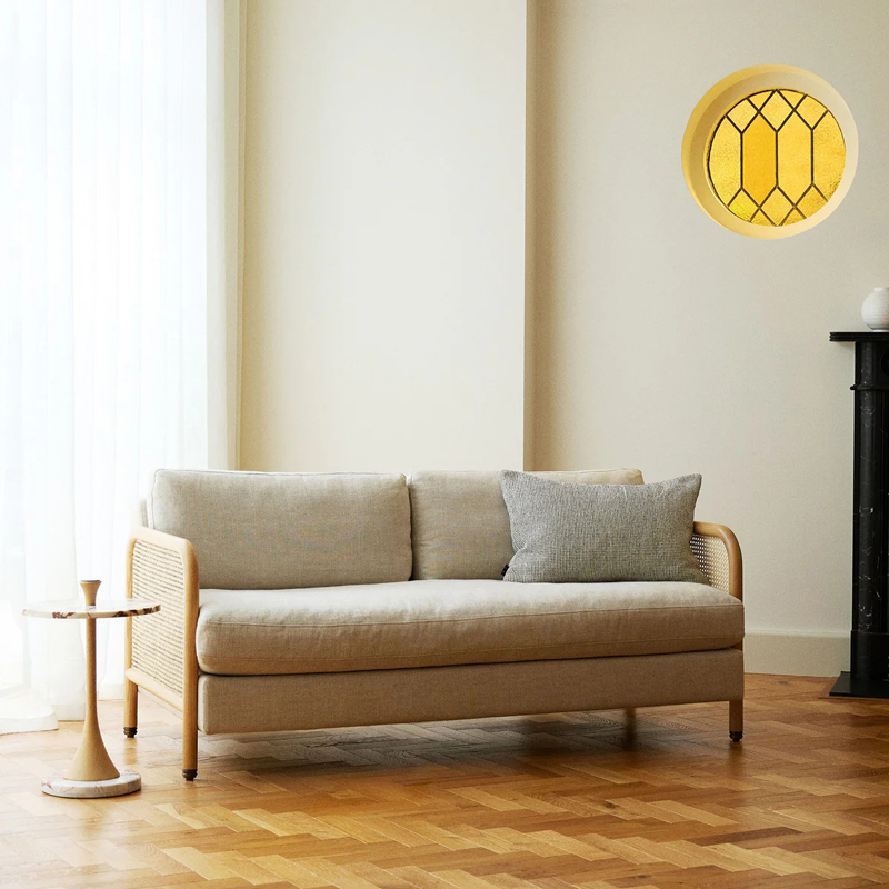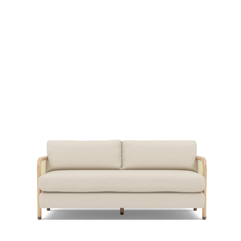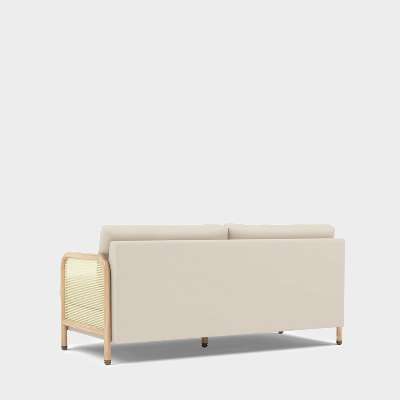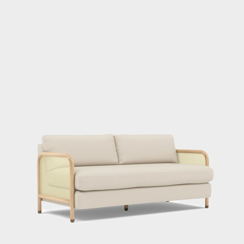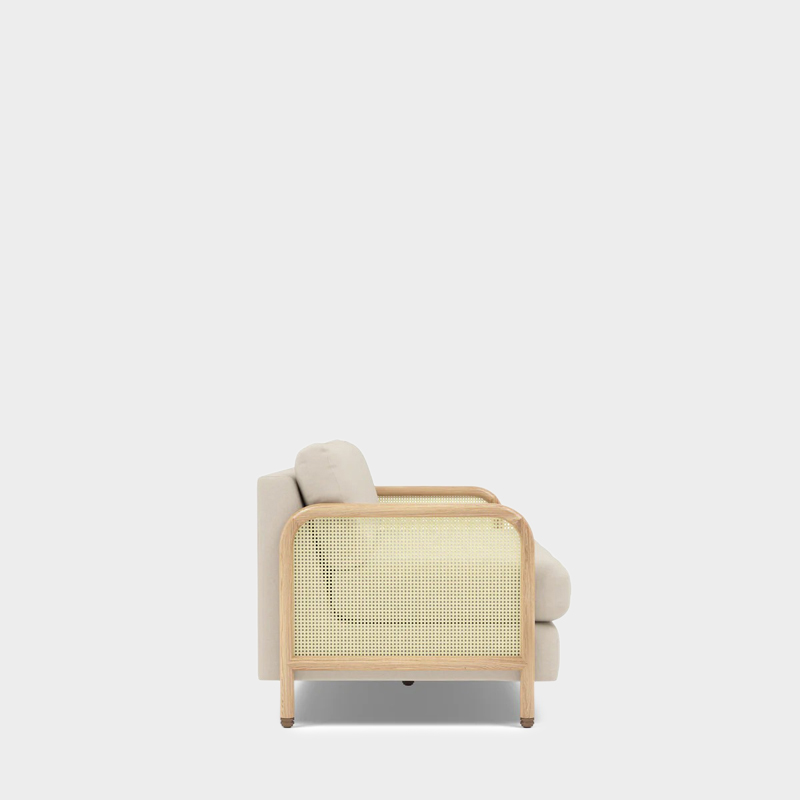 2シーターソファは、ソリッドオークのフレームにラタンのサイドパネルを組み合わせ、張地にはベルギーリネンを採用して作られました。