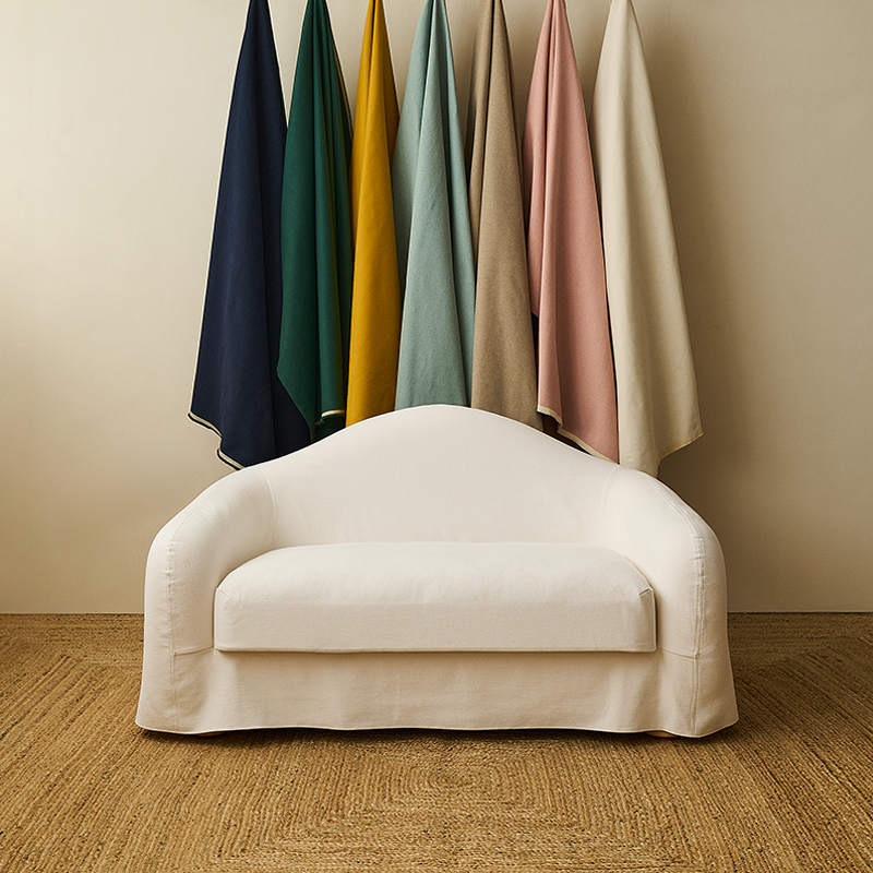 張地にはイタリア製コットンのウォッシャブルカバーを採用し、日常での使いやすさにも配慮しました。カラーバリエーションは全8色。脚部にはヒノキ材を使い、日本の住環境に適した、床を傷めにくい構造としています。