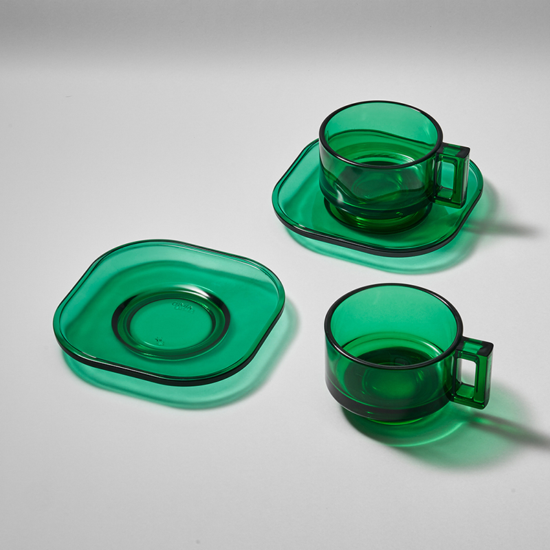 実用的なスタッキング構造とエッジの効いたハンドルデザインを備えた、200mlのカップ&ソーサーセット。