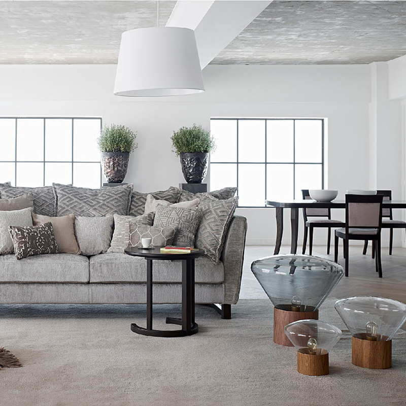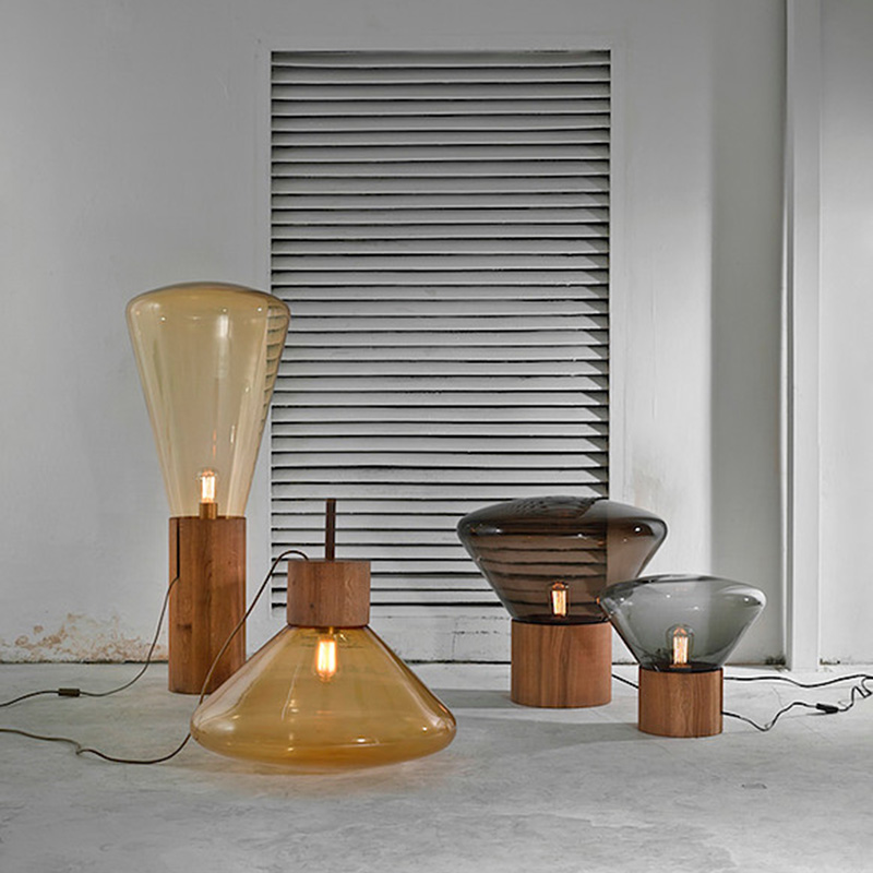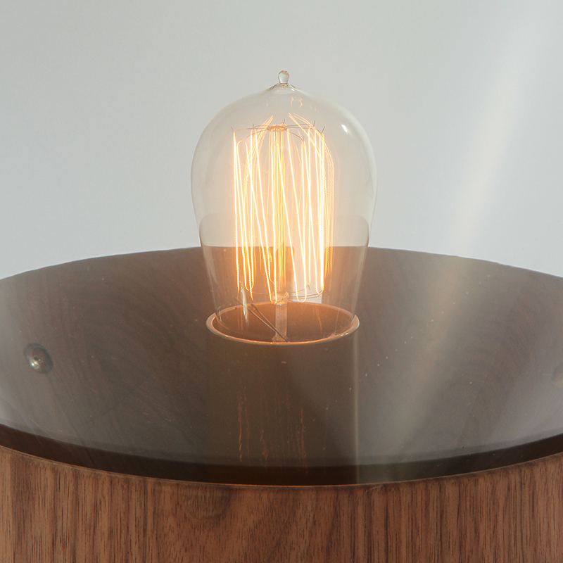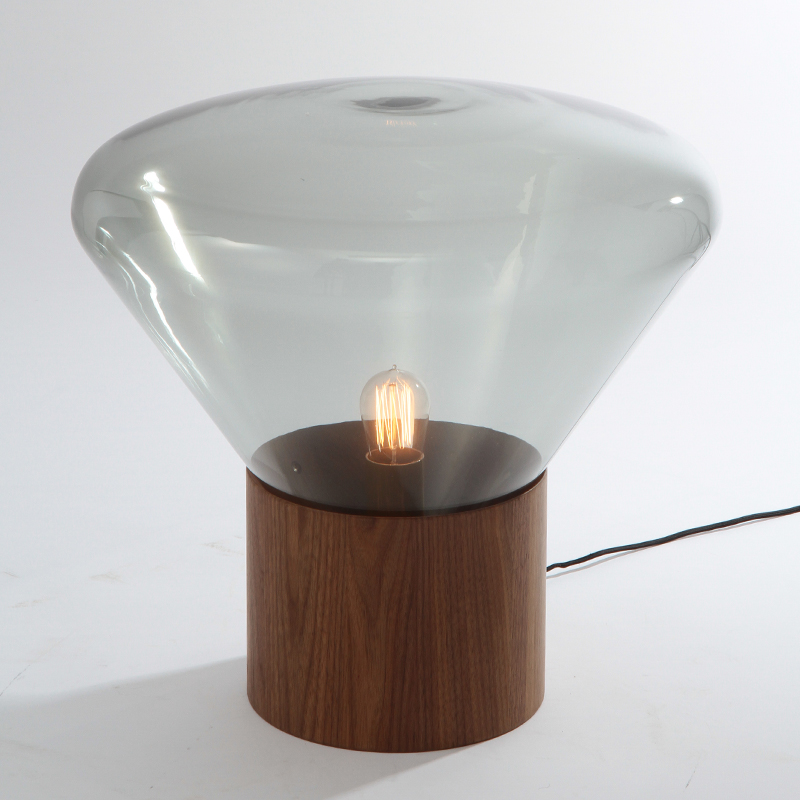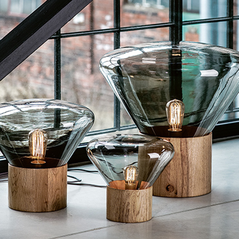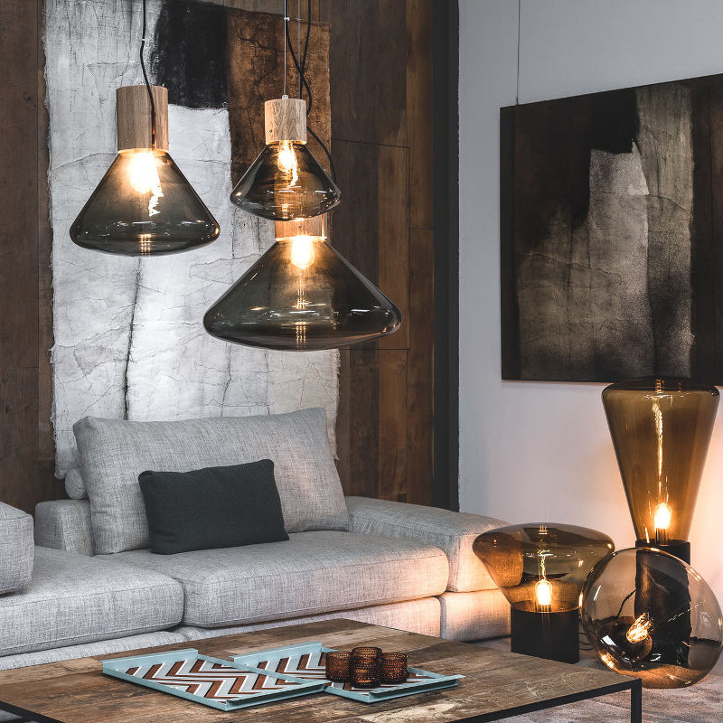 MUFFINSはティンテッドガラスと呼ばれる特別な着色ガラスを用い伝統的な手吹きの製法で仕上げています。その堂々とした佇まいは、丁寧に形作られた手吹きガラスと木目の美しい天然木の見事な融合により生まれました。円錐状に膨らんだガラスのシェードを通して放たられるフィラメント電球の光は、どんな空間にも華やぎをもたらしてくれます。