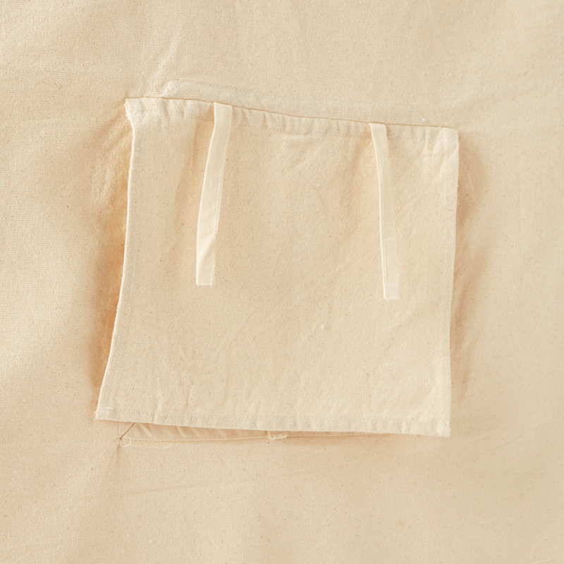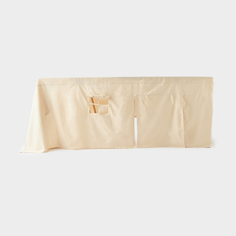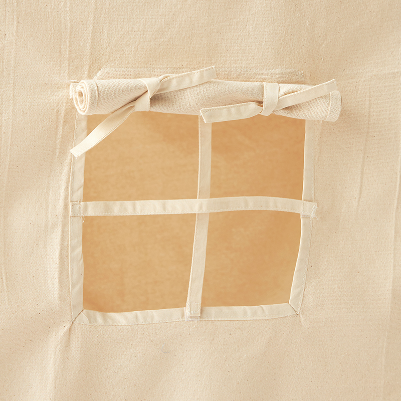 無染色のポストインダストリアルコットンを使用し、ロールアップ式のドアと3つの窓付き。