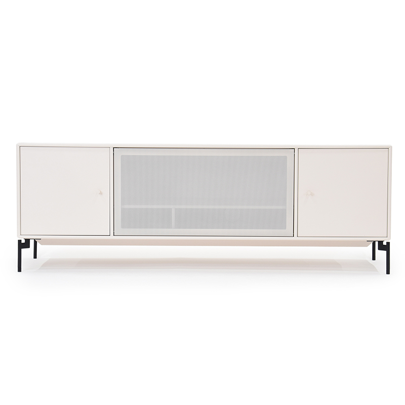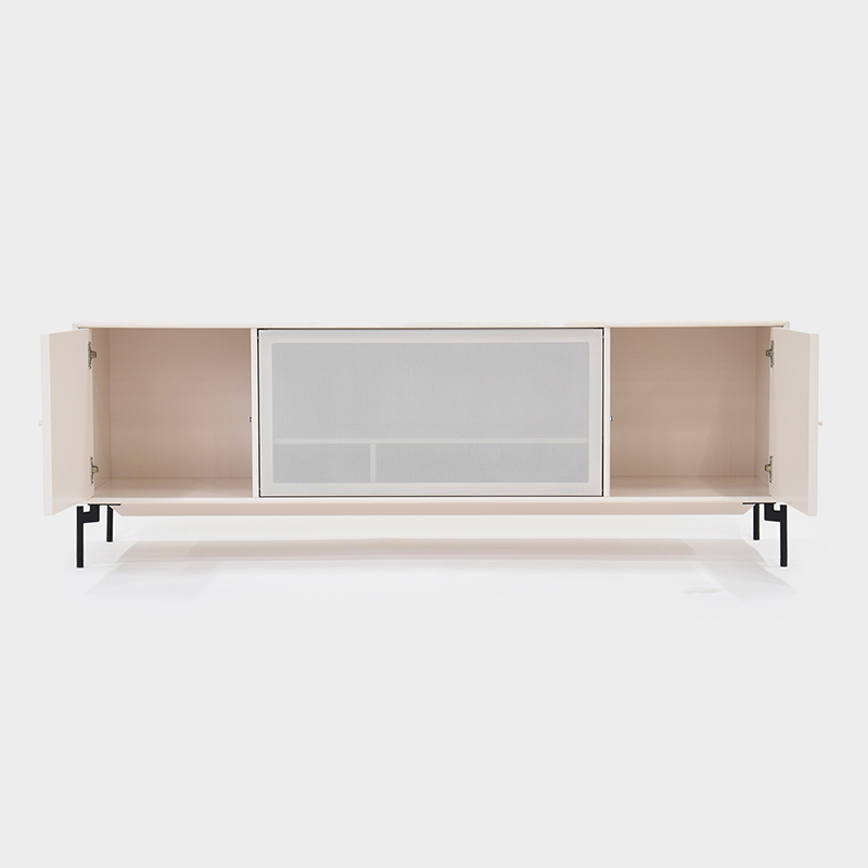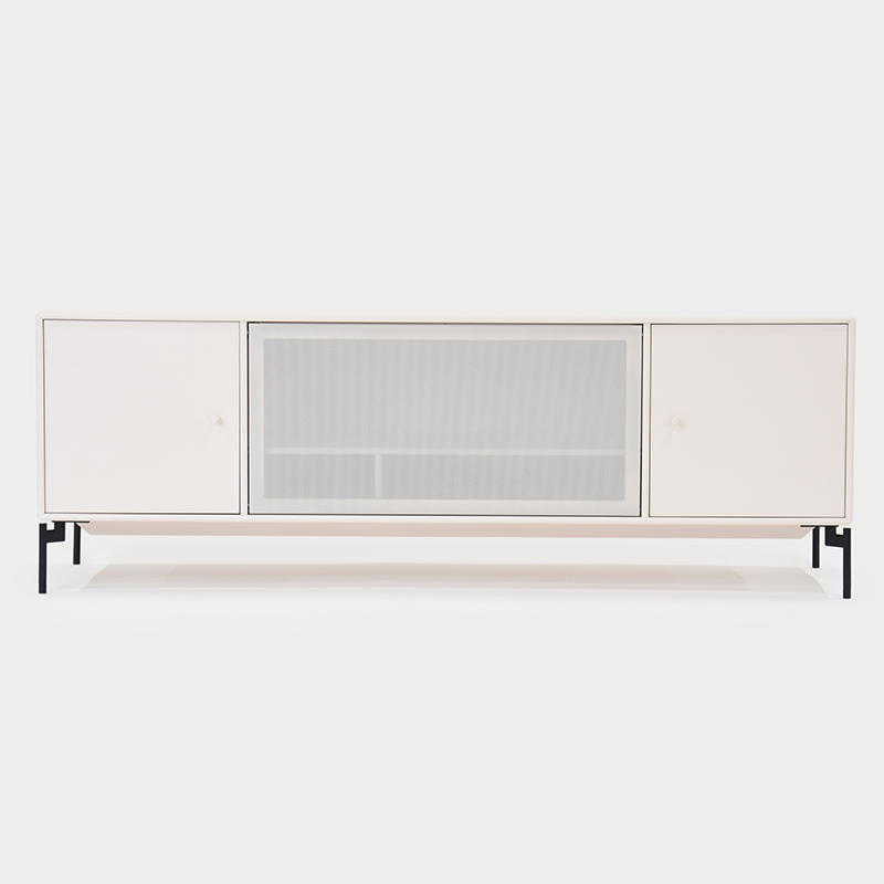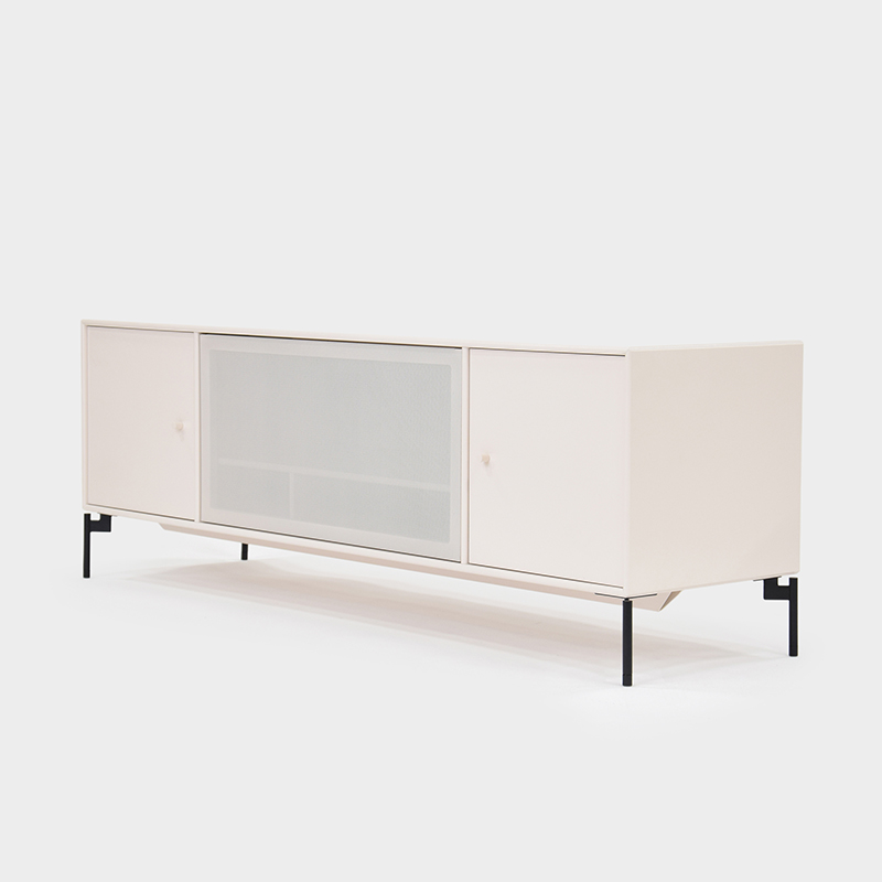 中央のドアは上部にスライドして収納することができ、表面に施されたパンチング穴によりドア越しに電子機器の操作が可能なほか、排熱にも効果があります。